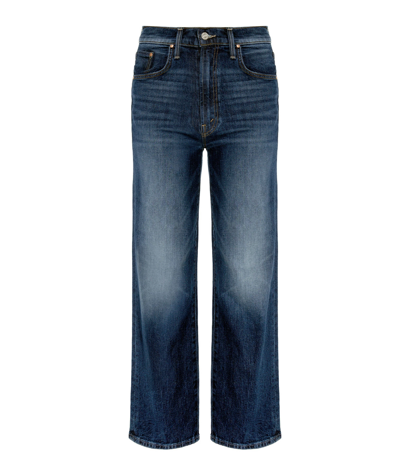 Pantalon large en denim de coton bleu délavé. Braguette boutonnée et zippée. Boutons métalliques avec logo gravé. Passants pour ceinture. Deux poches italiennes et une poche à gousset sur le devant. Deux poches plaquées dans le dos. Coupe droite. Base droite.