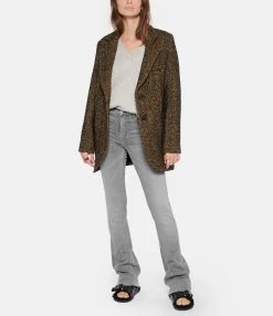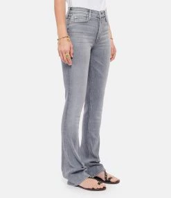 Jean flare en denim gris. Fermeture par zip et bouton. Passants pour ceinture. Cinq poches. Coupe slim, évasé en bas.