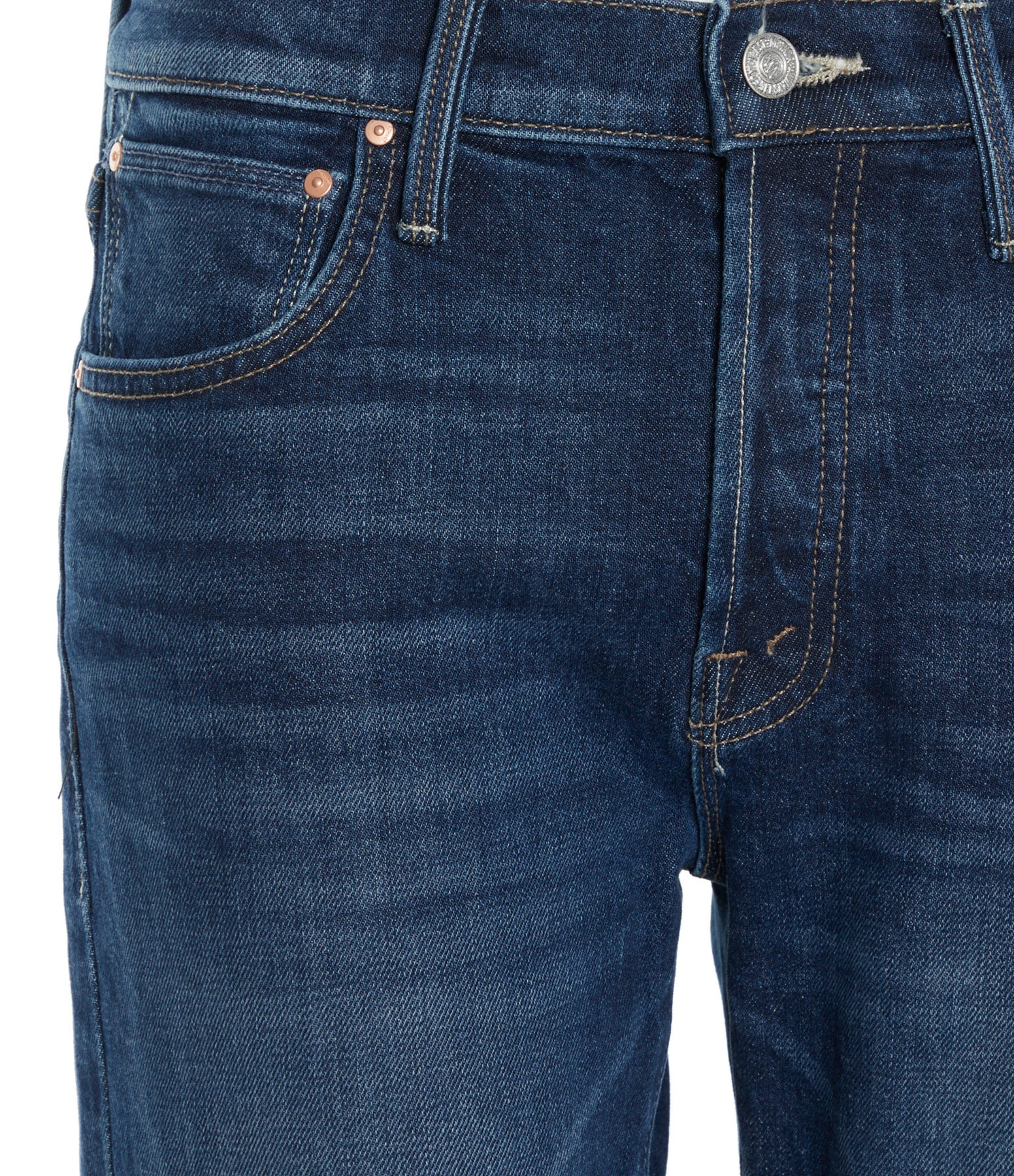 Pantalon en denim de coton bleu délavé. Braguette boutonnée. Boutons métalliques avec logo gravé. Passants pour ceinture. Deux poches italiennes et une poche à gousset sur le devant. Deux poches plaquées dans le dos. Coupe droite. Base droite coupée à cru.