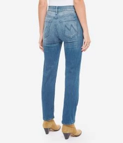 Jean droit en coton mélangé bleu. Taille haute avec passants pour ceinture. Braguette boutonnée. Boutons et rivets métalliques blanc. Deux poches italiennes et une poche à gousset. Deux poches plaquées dans le dos brodées de la lettre “M” en bleu. Empiècement dans le dos. Coupe droite. Base droite. Effet délavé. Non doublé.
