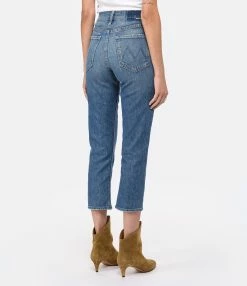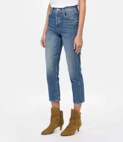 Jean droit en denim de coton bleu délavé. Taille haute. Cinq poches. Fermeture par boutons métalliques. Coupe droite. Base droite.