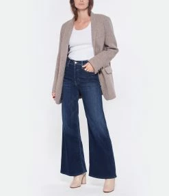 Jean large en coton mélangé bleu marine. Taille haute avec passants pour ceinture. Braguette boutonnée. Boutons et rivets métalliques rose gold. Deux poches italiennes et une poche à gousset. Deux poches plaquées dans le dos brodées de la lettre “M” ton sur ton. Empiècement dans le dos. Coupe large. Base droite. Effet délavé. Non doublé.