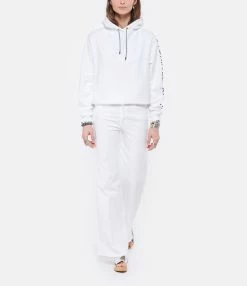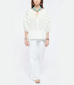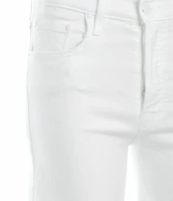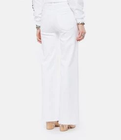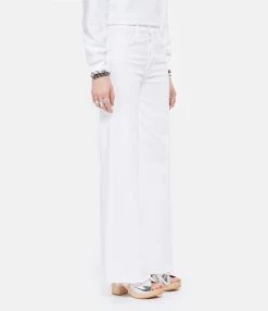 Jean large en denim blanc. Cinq poches. Fermeture boutonnée et passants pour ceinture. Coupe large avec bords coupés à crus.