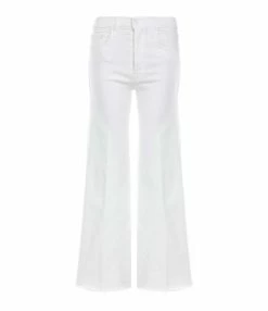 Jean large en denim blanc. Cinq poches. Fermeture boutonnée et passants pour ceinture. Coupe large avec bords coupés à crus.