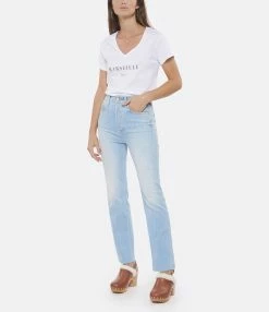 Jean en denim de coton mélangé bleu clair délavé. Braguette boutonnée. Boutons métalliques beiges avec logo gravé. Passants pour ceinture. Deux poches italiennes et une poche à gousset. Deux poches plaquées dans le dos. Taille haute. Coupe flare. Base droite avec bords francs.