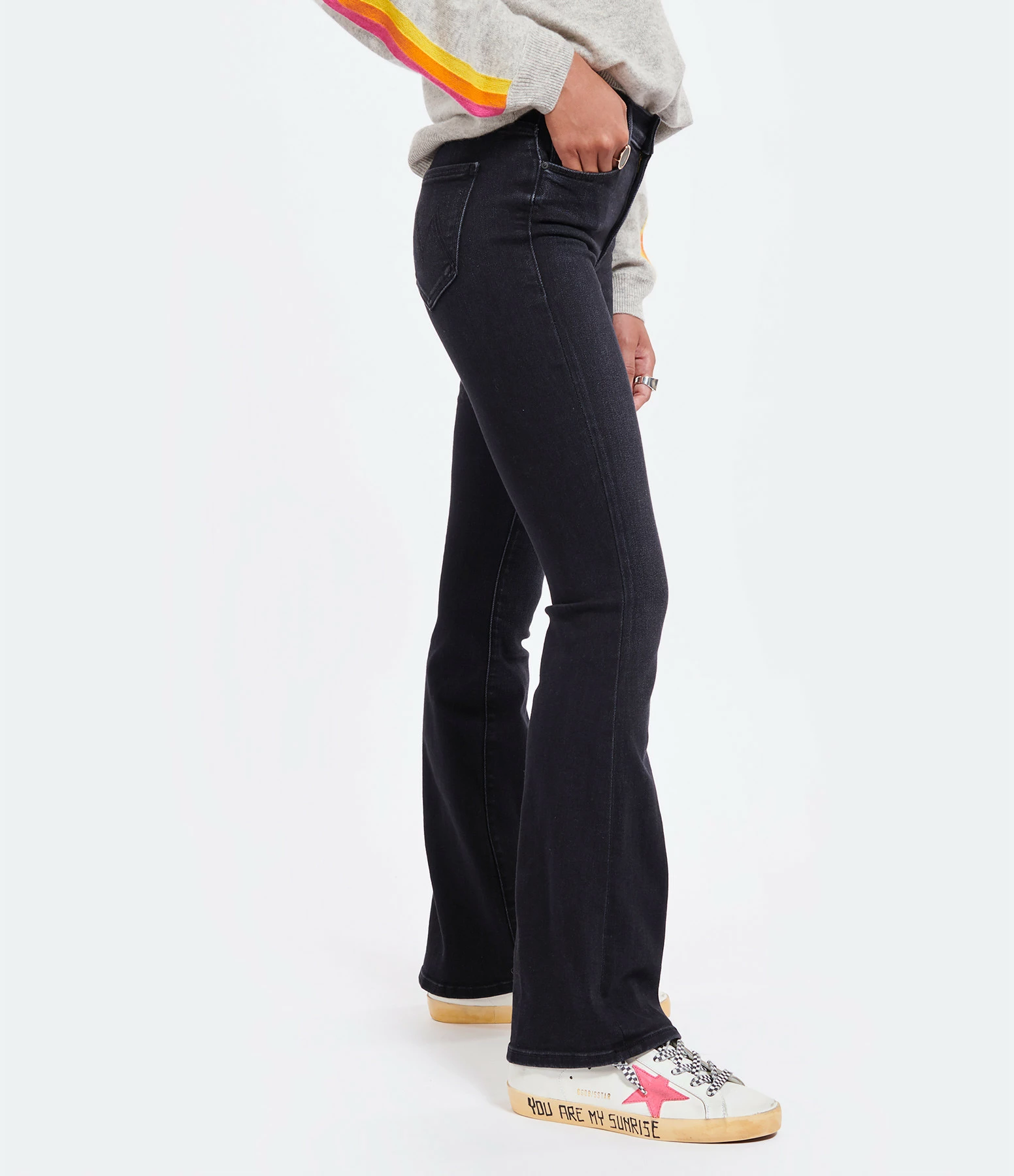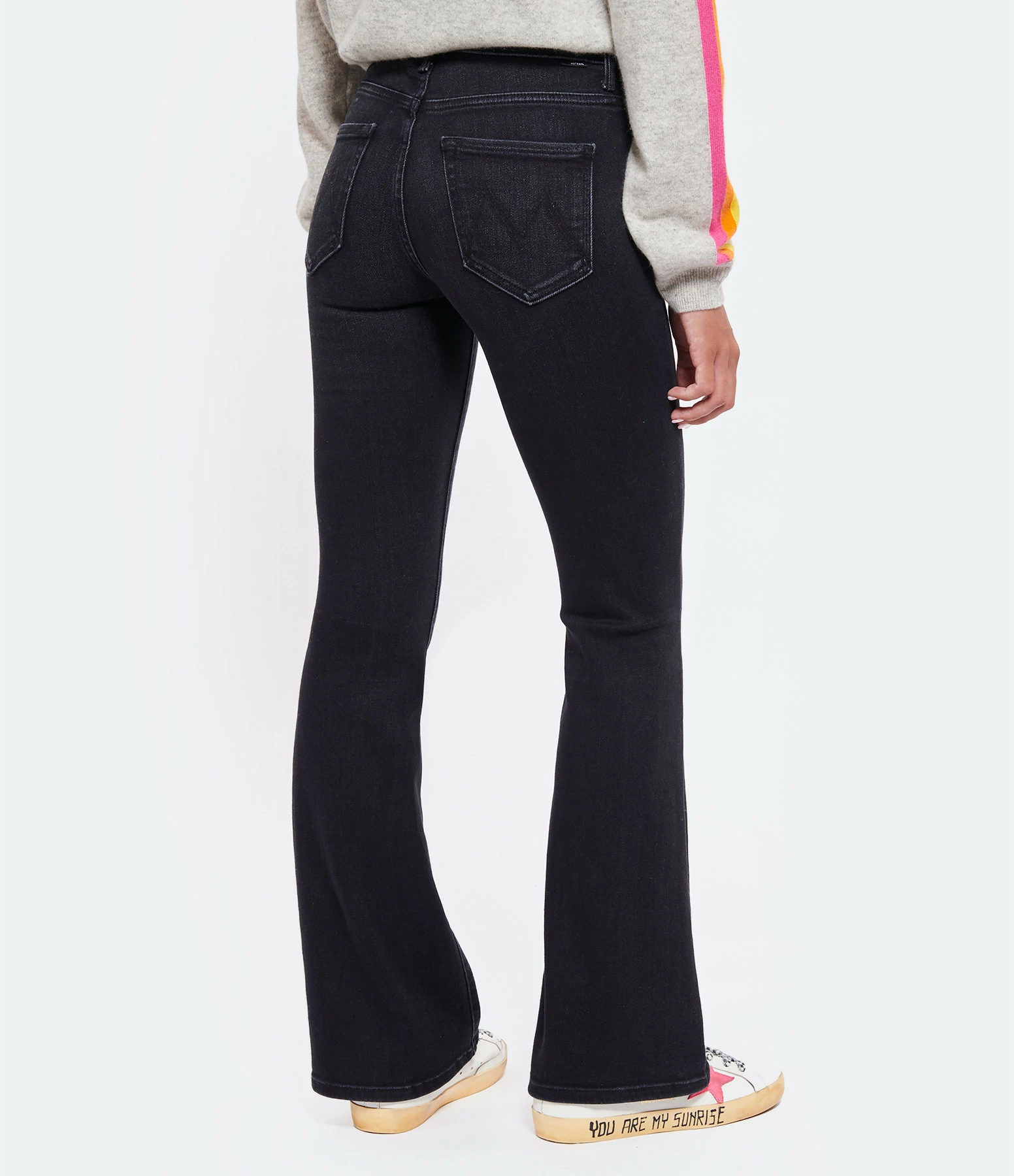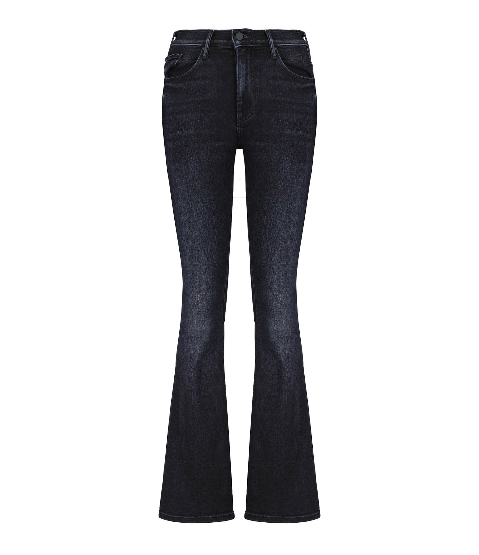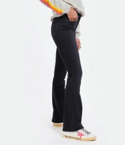 Jean en denim noir, légèrement décoloré aux genoux. Taille haute. Coupe bootcut évasée aux chevilles. Cinq poches. Fermeture par zip et bouton