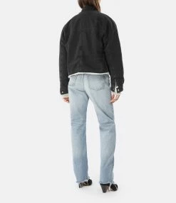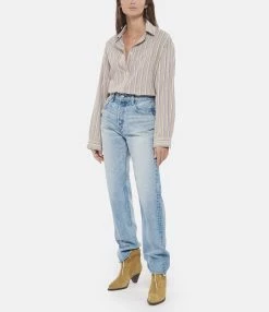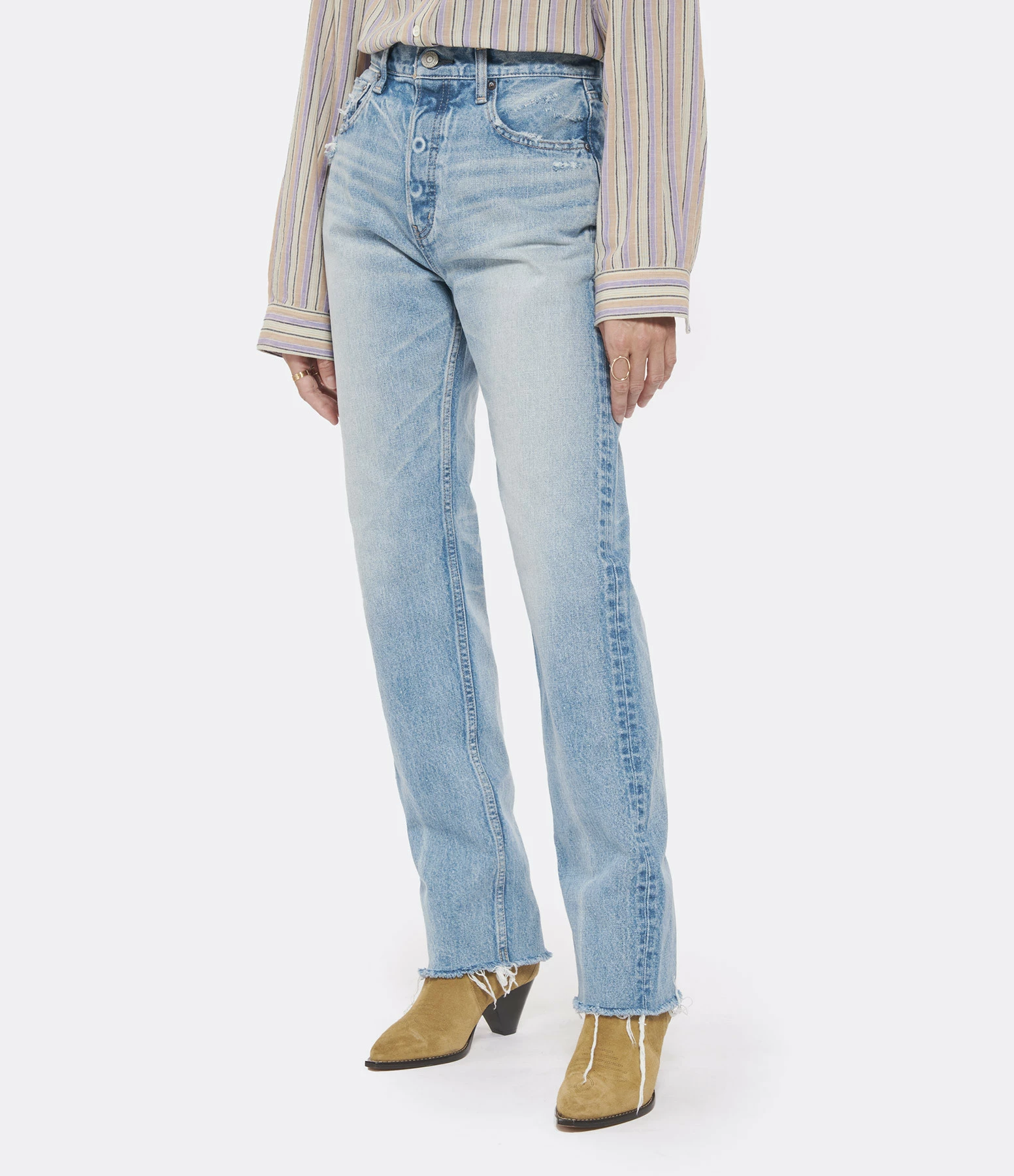 Pantalon en denim de coton bleu délavé. Braguette boutonnée. Boutons métalliques avec logo gravé. Passants pour ceinture. Deux poches italiennes et une poche à gousset. Deux poches plaquées dans le dos. Jacron en cuir lisse beige. Coupe droite large. Base droite avec bords francs. Effet usé et déchiré.