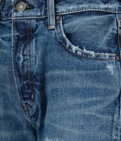 Pantalon en denim de coton bleu délavé. Braguette boutonnée. Boutons métalliques avec logo gravé. Passants pour ceinture. Deux poches italiennes et une poche à gousset. Deux poches plaquées dans le dos. Jacron en cuir lisse beige. Coupe droite. Base droite avec ourlet rabattu et bords francs. Effet usé et déchiré.
