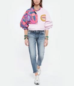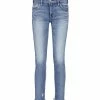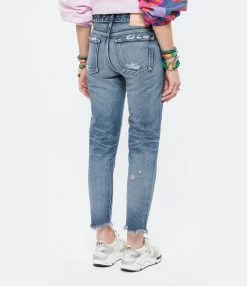 Jean bleu délavé à abrasions et effets usés par endroits. Taille haute. Fermeture par zip. Cinq poches. Coupe straight : droite avec bas de jambe resserré coupée