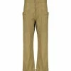 Pantalon en denim de coton bleu délavé. Fermeture par boutons métalliques gravés du logo. Passants pour ceinture. Deux poches italiennes et une poche à gousset. Deux poches plaquées dans le dos. Jacron en cuir lisse beige. Coupe droite. Base droite avec ourlet rabattu et bords francs. Effet usé et déchiré.