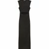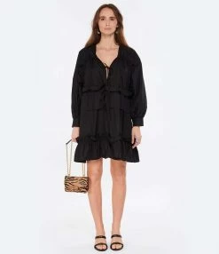 Robe courte en coton noir. Volants et plissée au niveau des épaules, de la taille et au bas de la jupe. Col en V avec cordons de serrage sur plusieurs niveaux. Manches longues avec boutons de fermeture aux poignets. Coupe droite. Base droite.