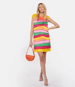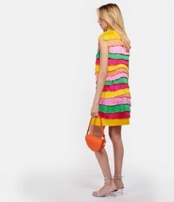 Robe courte à franges multicolore. Col rond. Fermeture zippée invisible dans le dos. Sans manches. Coupe droite. Base droite. Doublée.