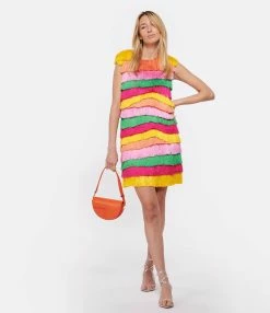 Robe courte à franges multicolore. Col rond. Fermeture zippée invisible dans le dos. Sans manches. Coupe droite. Base droite. Doublée.