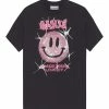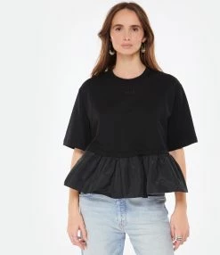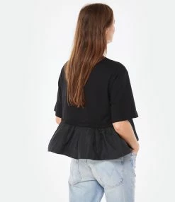 Tee-shirt en coton noir avec volants. Col rond. Inscription “MSGM” ton sur ton à l’avant. Manches courtes. Coupe droite.