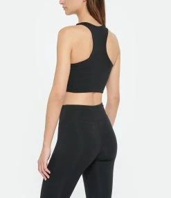 Brassière de sport en coton noir. Col rond. Inscription “new balance” en blanc au niveau de la poitrine. Base élastiquée.