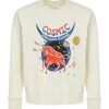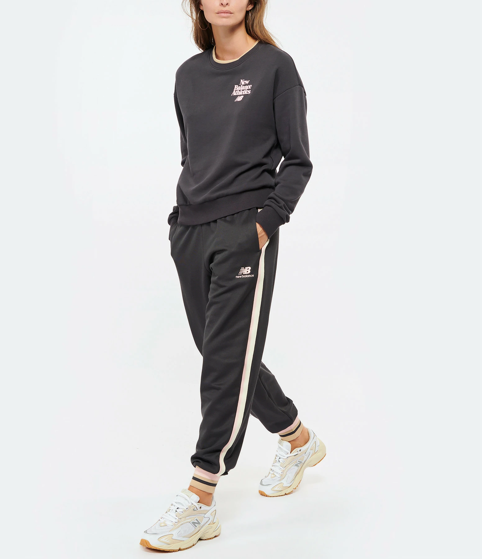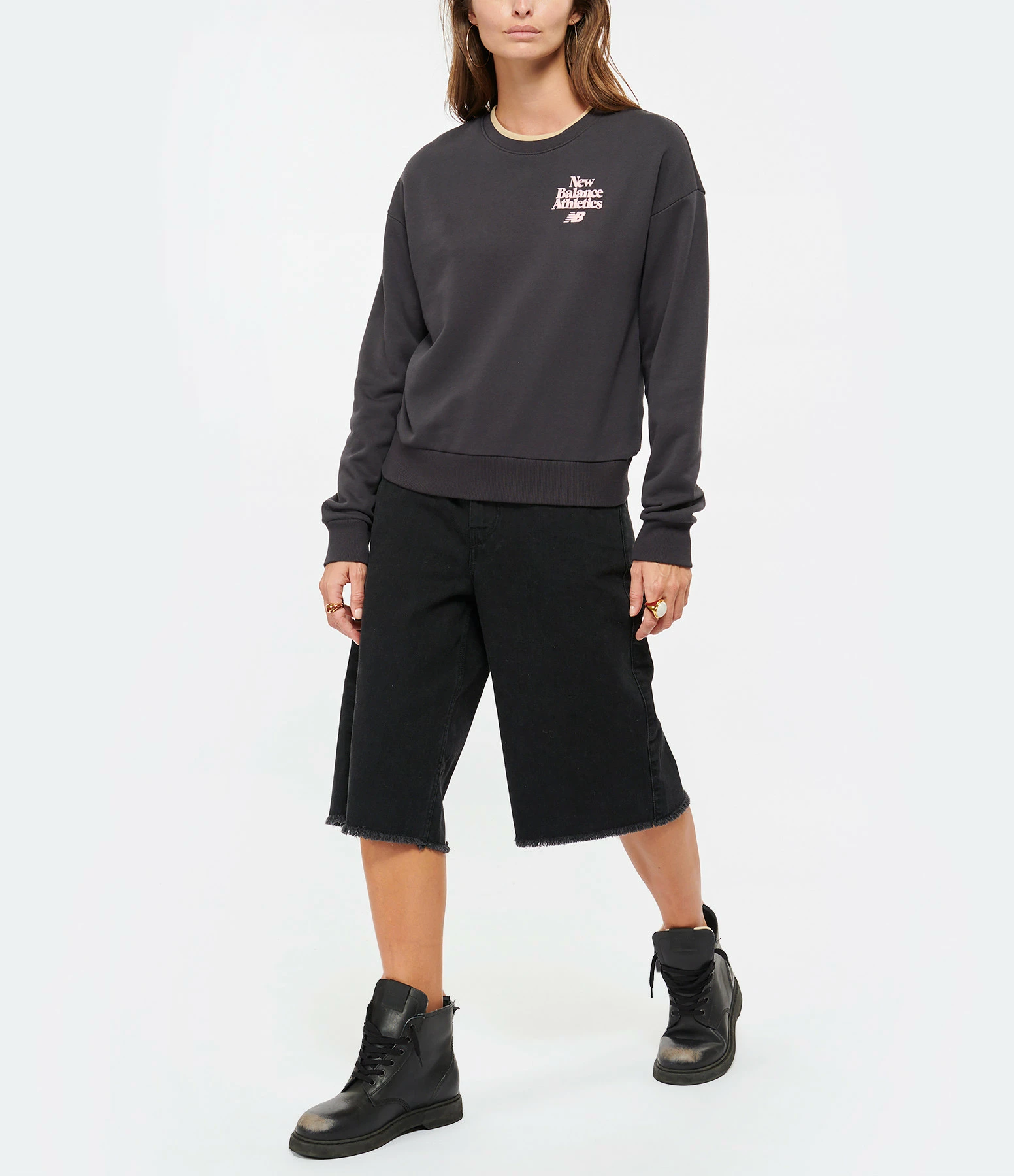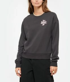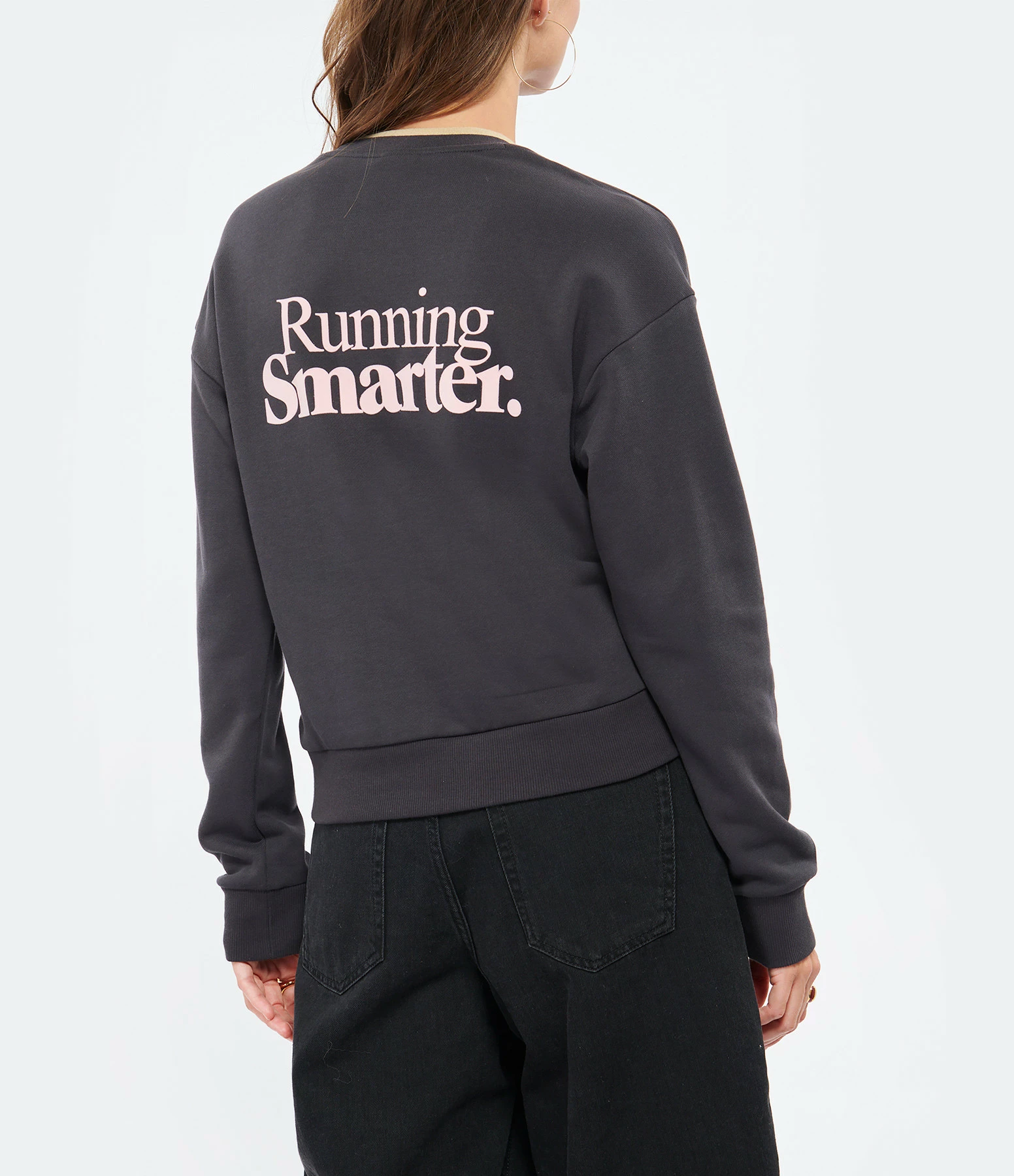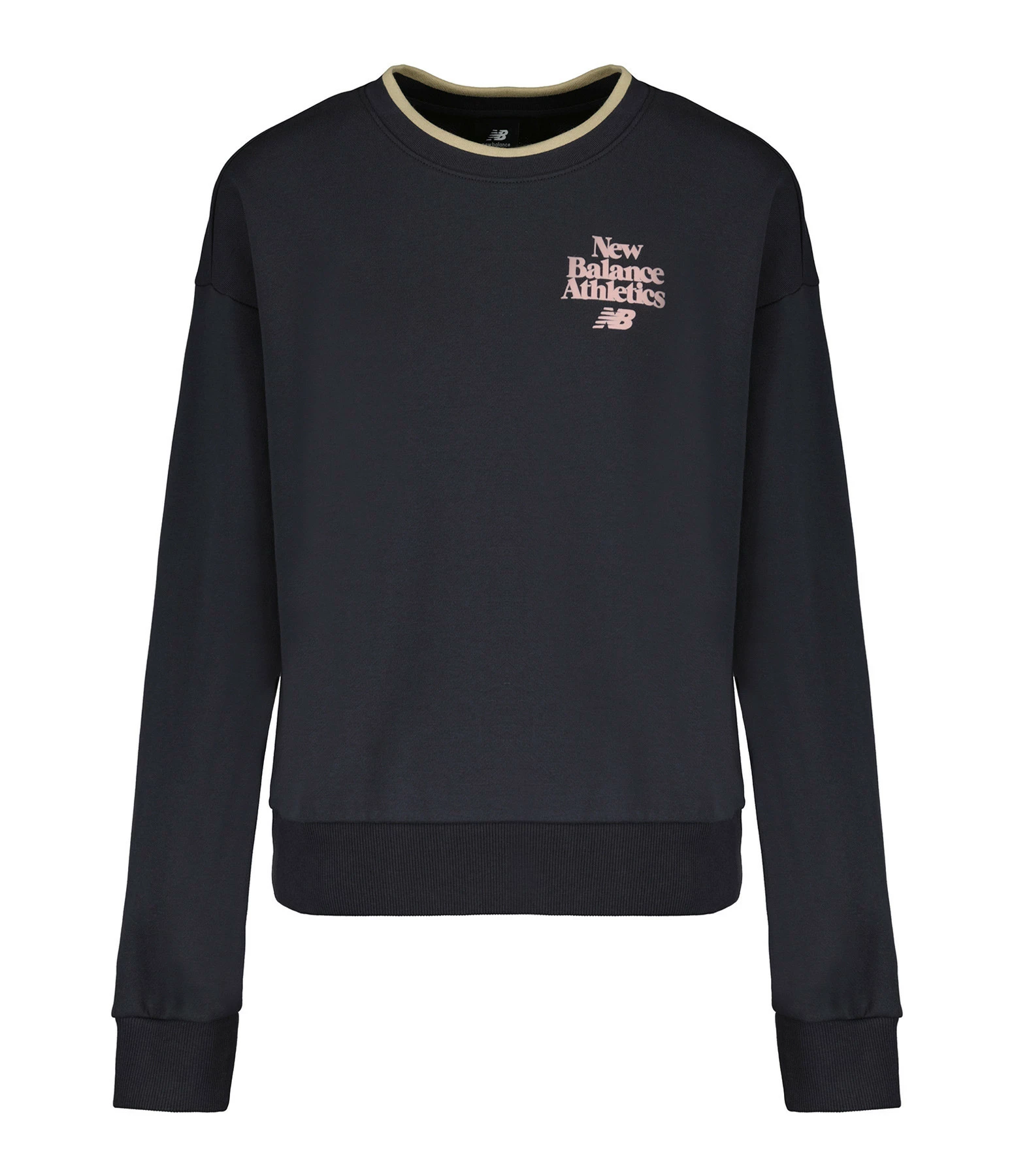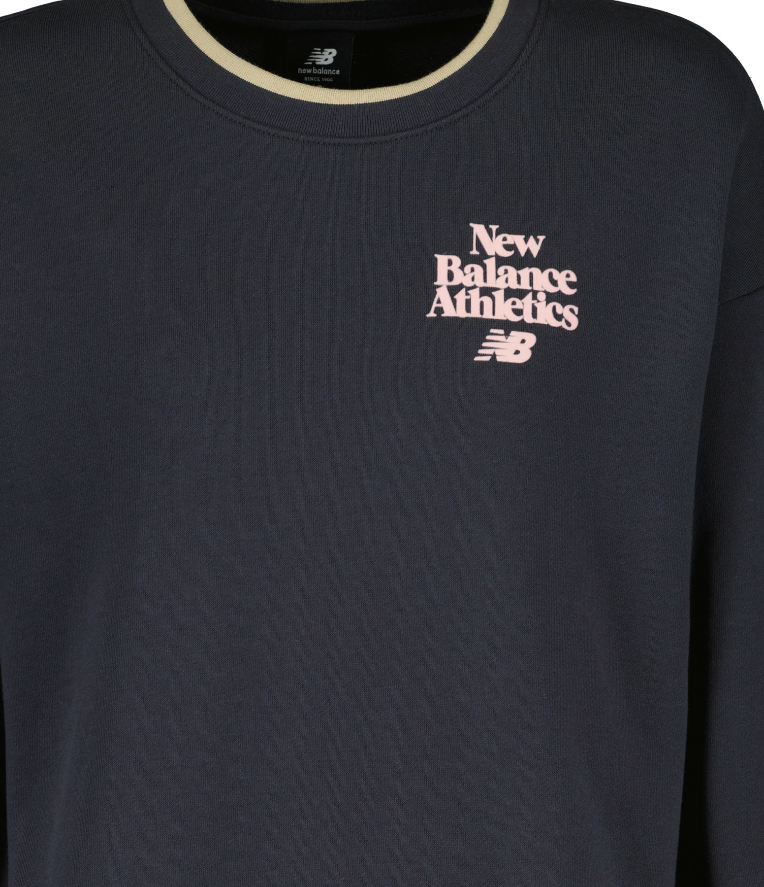 Sweatshirt en coton molletonné gris foncé. Inscription “New Balance Athletics” flockée velousen rose sur le devant. Inscription “Running Smarter.” flockée velours en rose dans le dos. Col rond côtelé beige contrastant avec un liseré marron. Manches longues avec poignets côtelés. Coupe droite. Base droite côtelée.