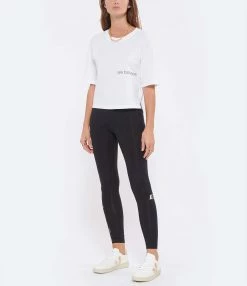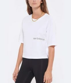 Tee-shirt court en coton blanc avec inscription “new balance” sur la poitrine et logo sur la manche droite. Col rond. Manches courtes. Coupe oversize. Base droite.