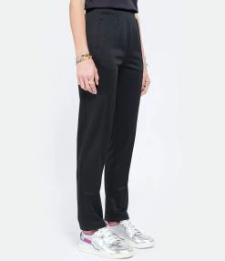 Jogging en tissu noir. Pli pressé à l’avant. Deux poches fendues sur les côtés. Taille élastiquée. Coupe droite.