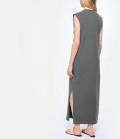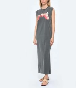 Robe débardeur en coton gris délavé. Sérigraphie “Love machine” rouge et écru à l’avant. Deux badges côté cœur. Fente sur le côté gauche. Col rond. Coupe droite. Base droite. Non doublée.