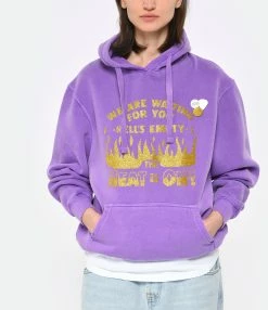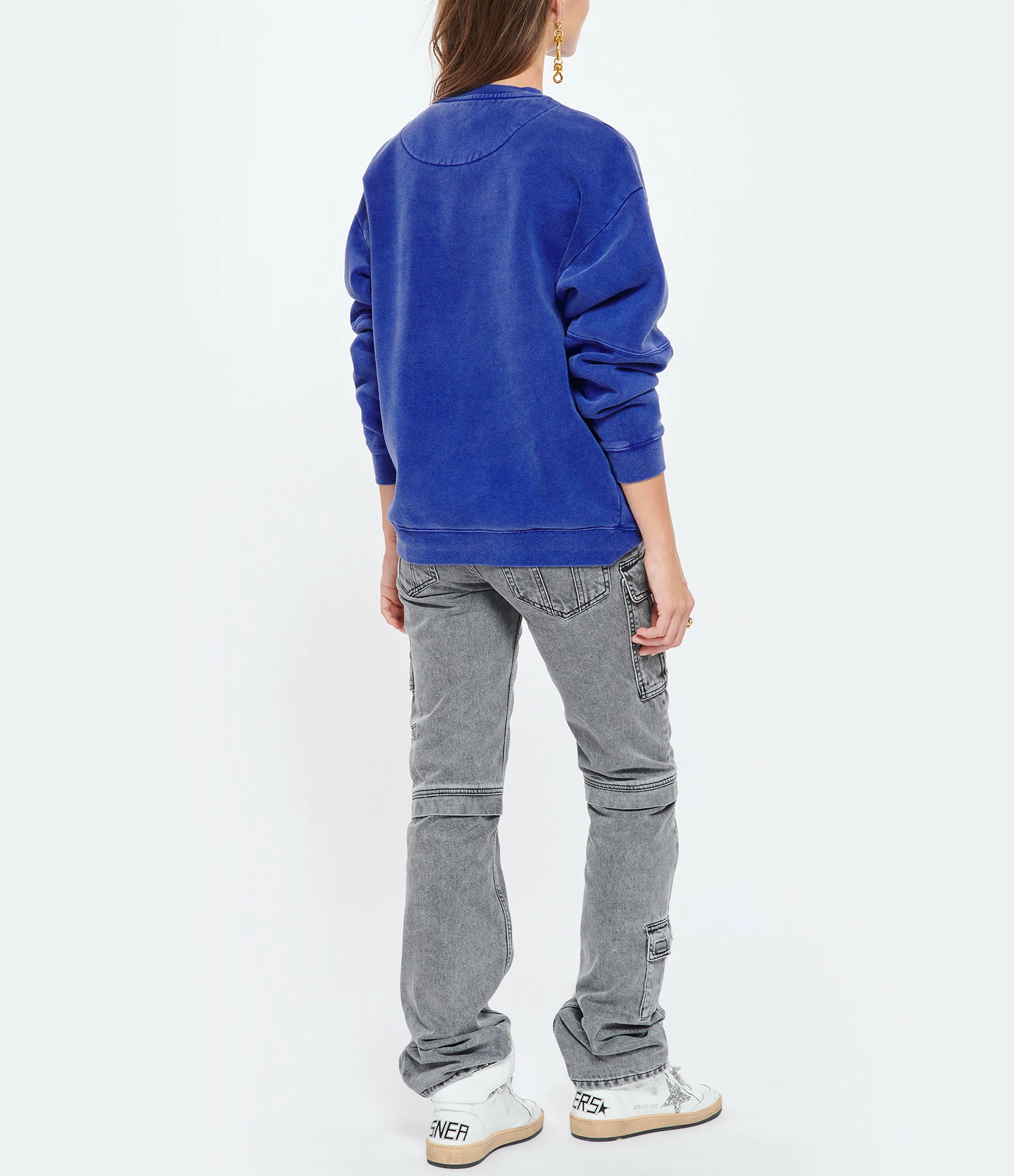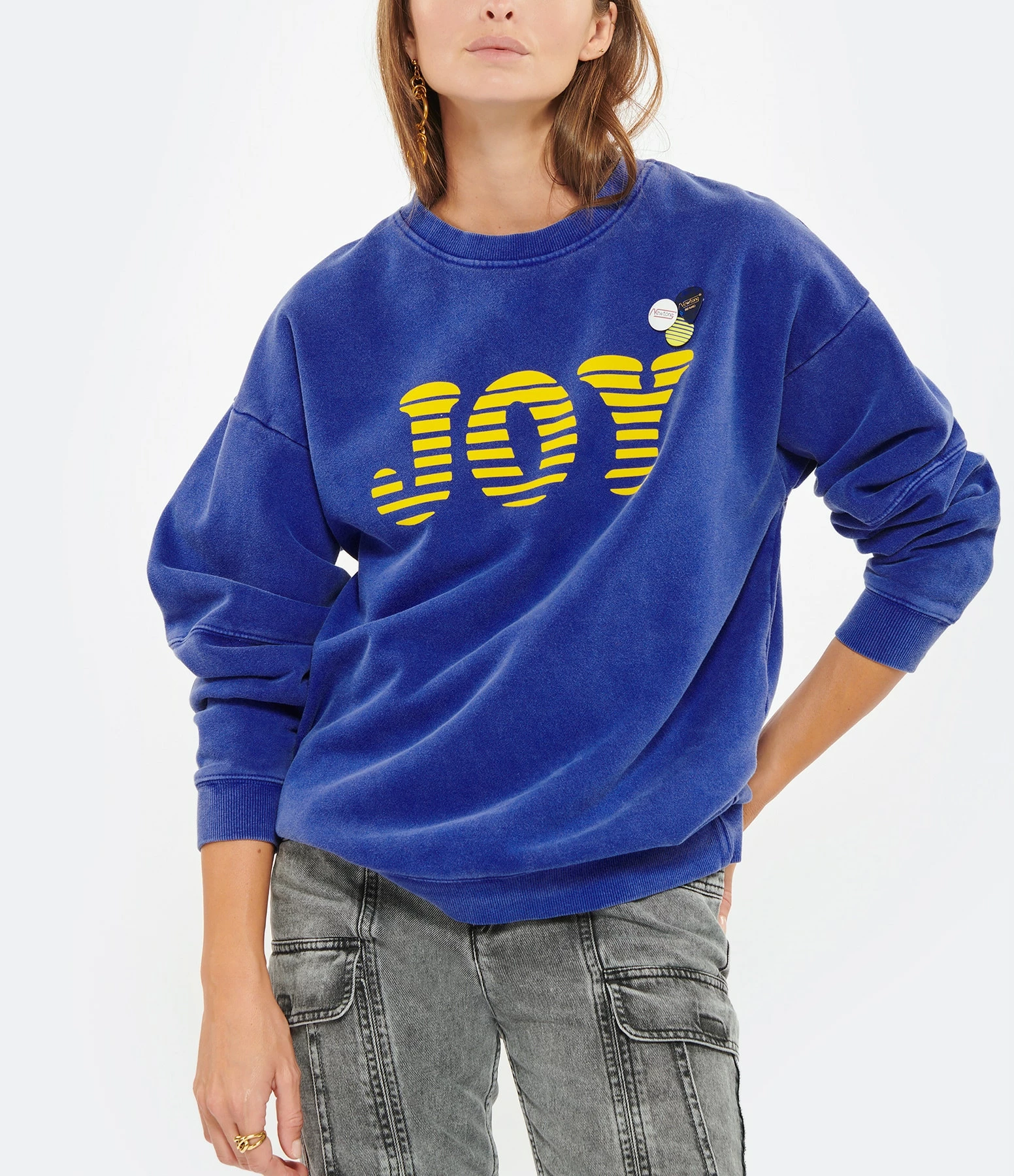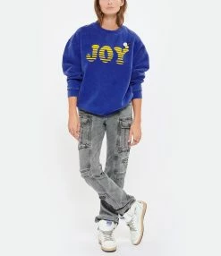 Sweatshirt en coton mélangé molletonné bleu. Flockage velours de l’inscription “Joy” en jaune sur le devant. Deux badges et un médiator. Col rond côtelé. Manches longues avec poignets côtelés. Coupe droite. Base droite côtelée