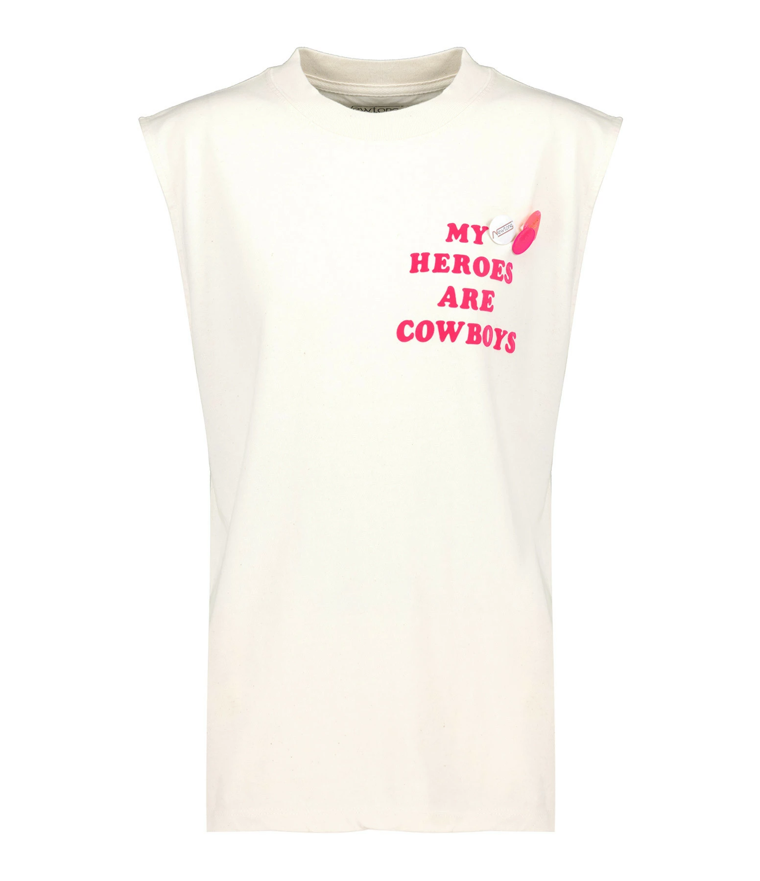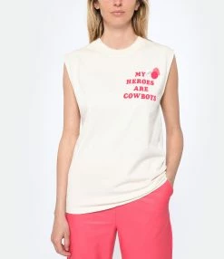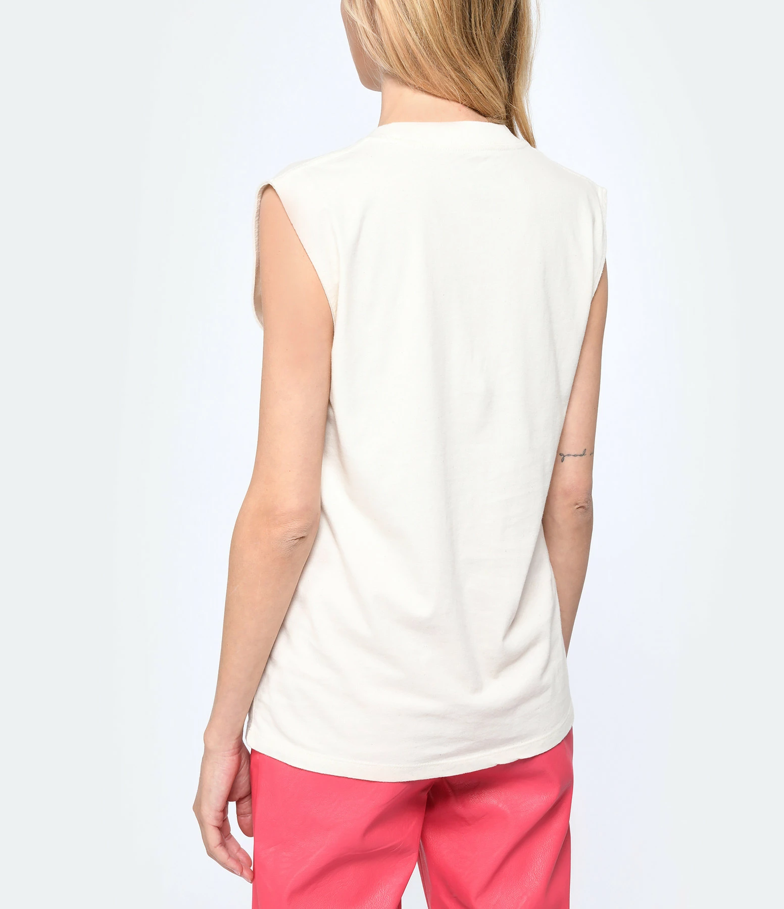 Débardeur en coton écru à inscription fuchsia niveau poitrine sur le devant. Sans manches. Col rond côtelé. Trois badges côté cœur. Coupe droite. Base droite.
