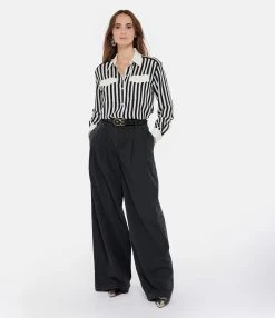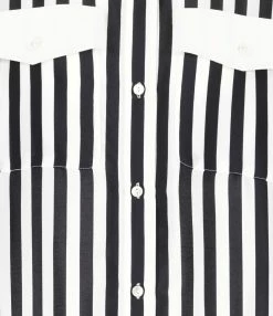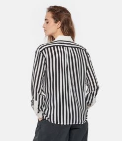 Chemise en soie à rayures noires et blanches. Manches longues. Col chemisier. Deux poches plaquées et boutonnées au niveau de la poitrine. Coupe droite. Base droite.