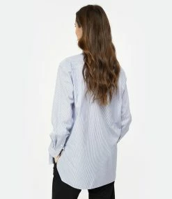 Chemise à rayures bleues et blanches en popeline de coton. Col chemise et manches longues. Base droite, aux angles arrondis et légèrement plus longue à l’arrière. Non doublée.