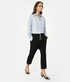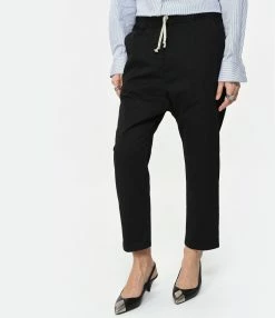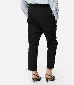 Pantalon style jogging noir. Taille élastiquée avec liens de serrage. Deux poches latérales et deux poches plaquées boutonnées à l’arrière. Jambes courtes.