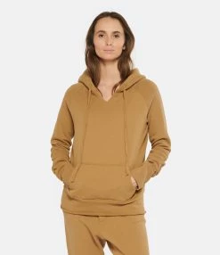 Hoodie à capuche en coton marron. Col légèrement fendu et capuche ajustable par lien de serrage. Manches longues. Une poche kangourou sur le devant. Coupe décontractée. Effets usés par endroits. Base droite roulottée. Non doublé.