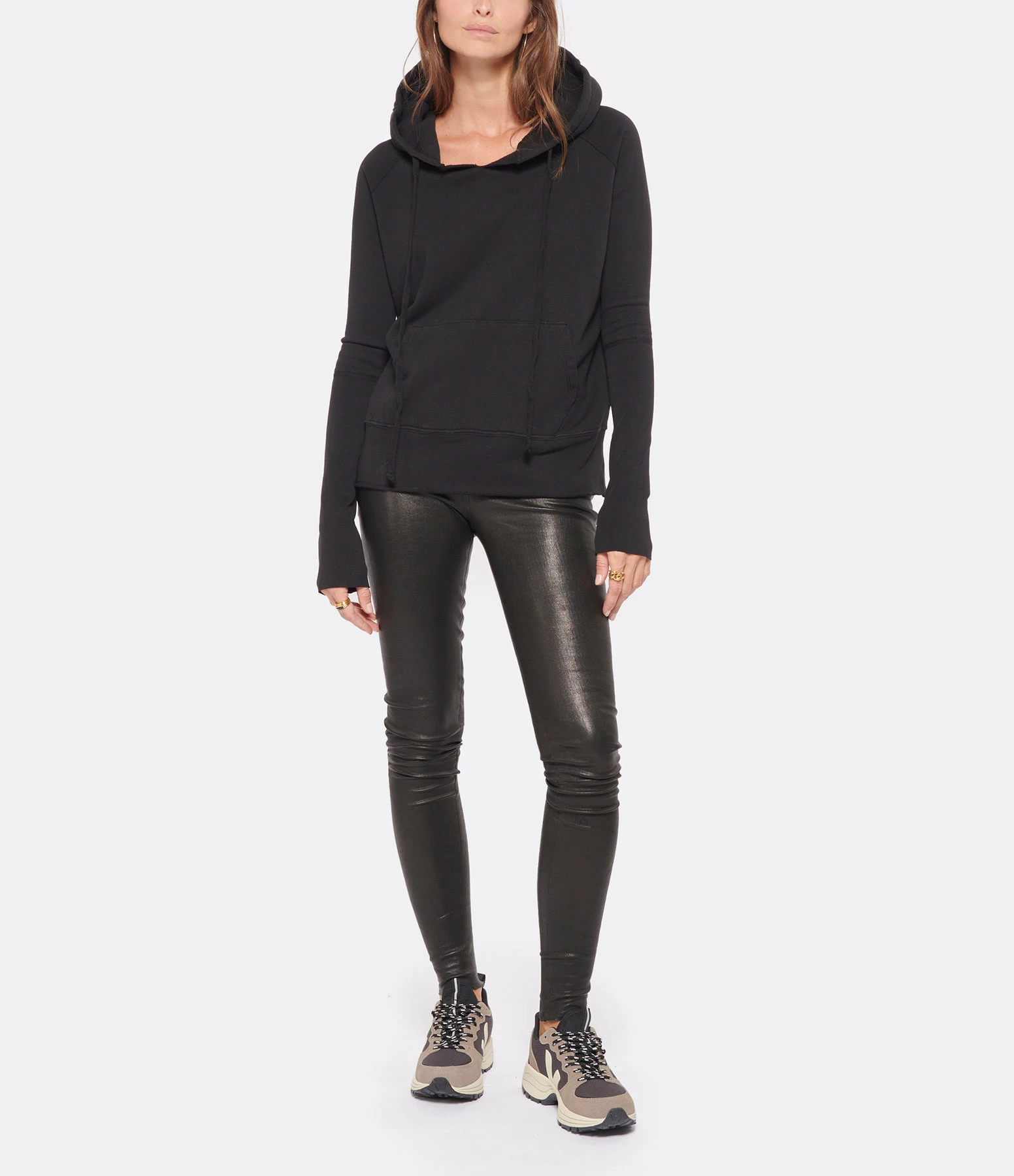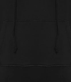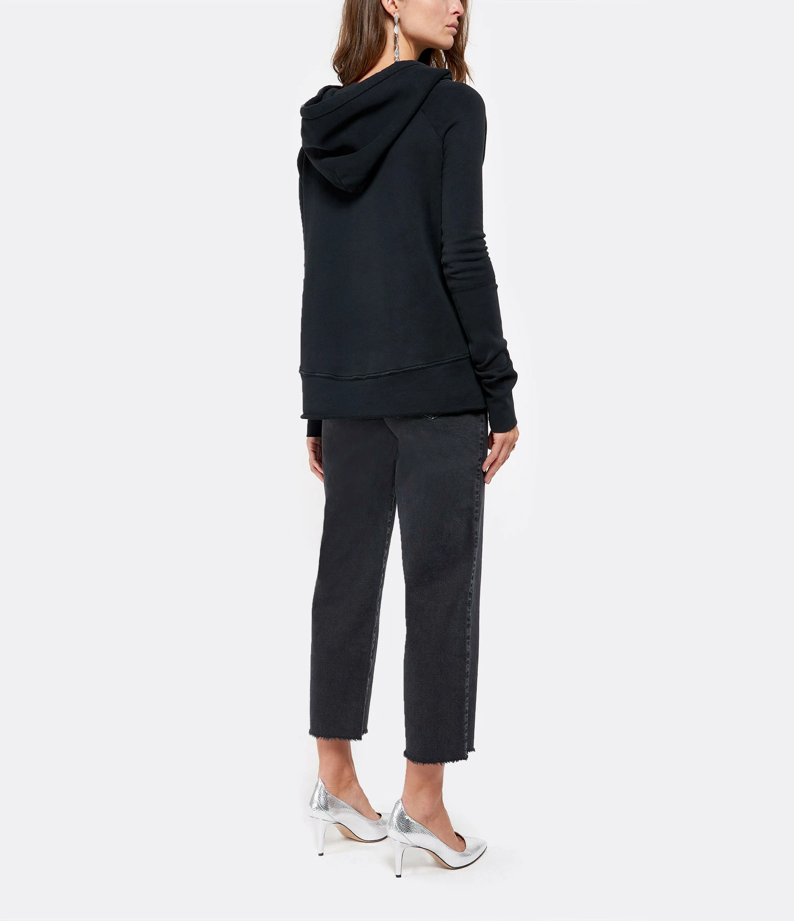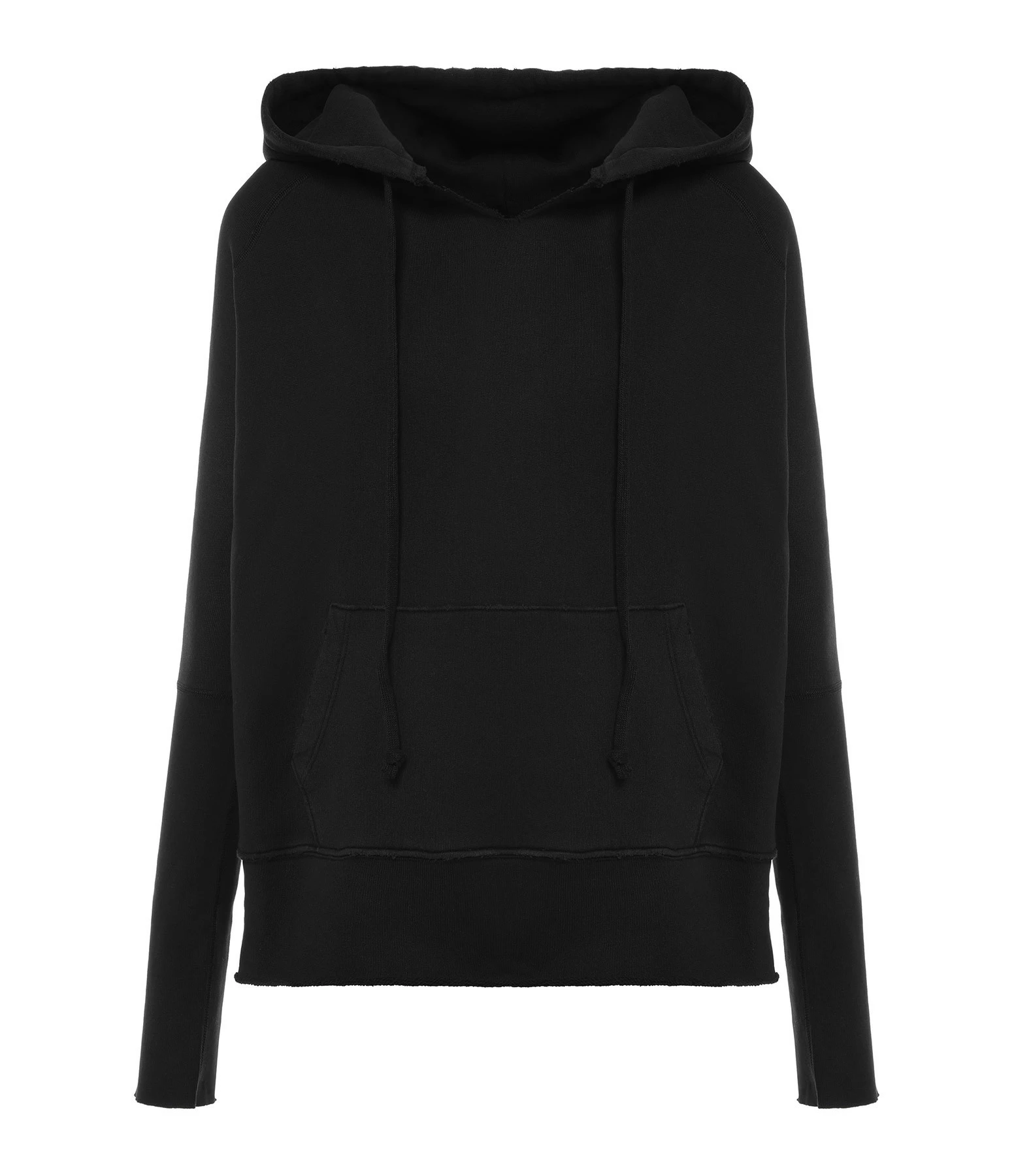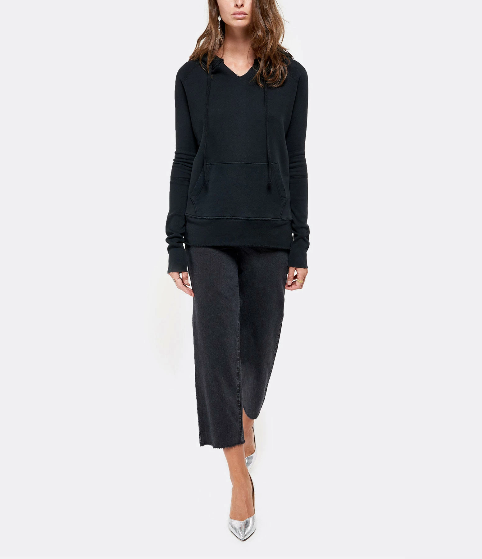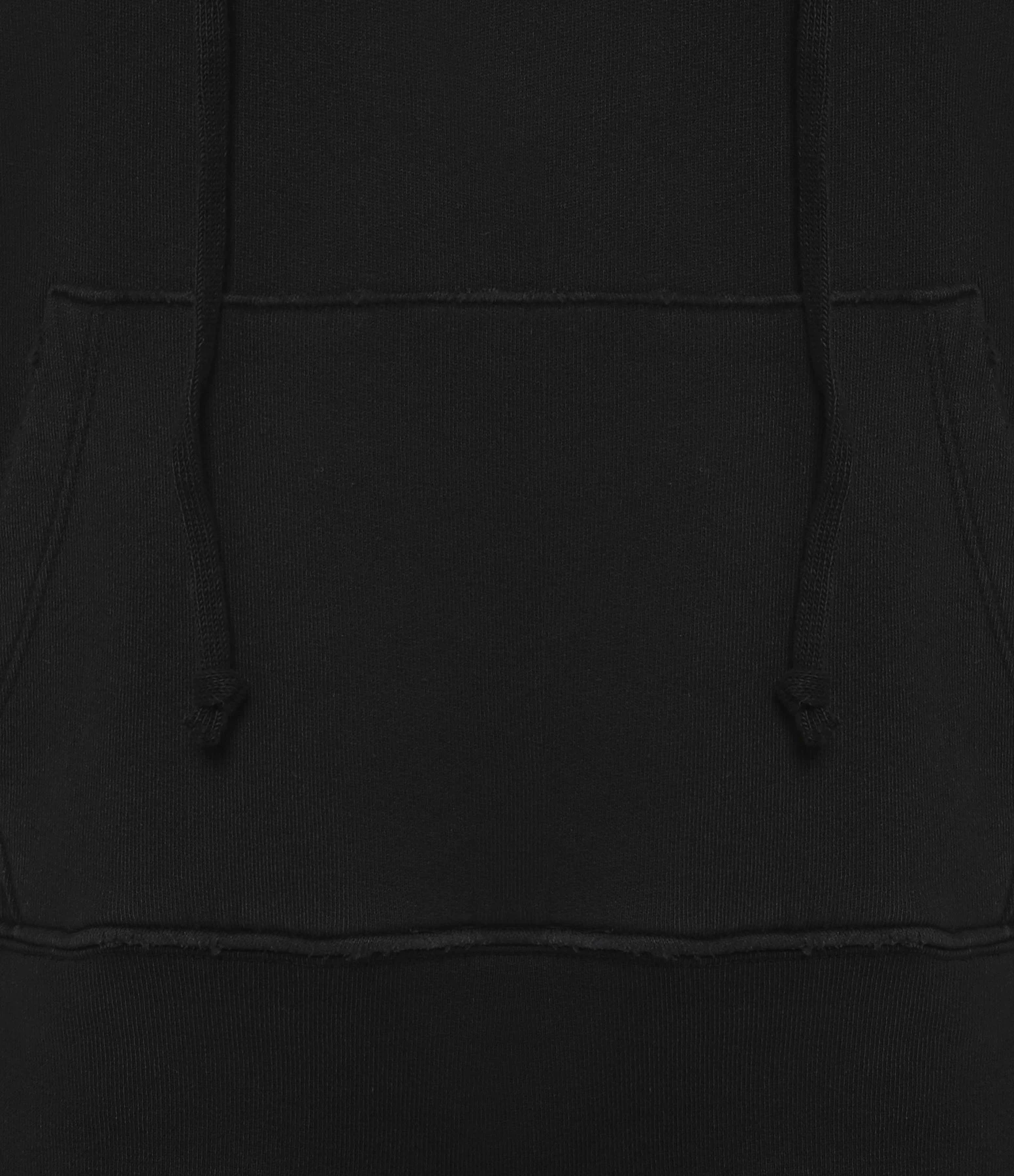 Hoodie à capuche noir en coton, pour femme. Col légèrement fendu et capuche ajustable par lien de serrage. Manches longues. Une poche kangourou. Coupe décontractée. Effets usés par endroits. Base droite roulottée. Non doublé.