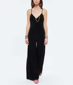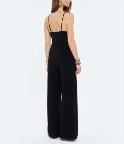 Combinaison à jambe large noire. Sans manches. Bretelles fines. Décolleté en V. Jambe évasée. Corsage doublé.