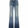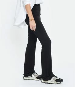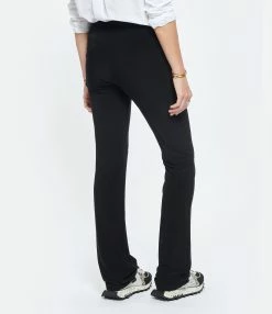 Pantalon en tissu stretch noir. Taille haute. Coupe flared. Base droite.