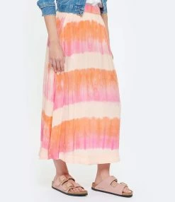 Jupe à imprimé orange et rose effet rayures tie & dye. Taille élastiquée. Deux poches italiennes. Coupe ample. Base droite.