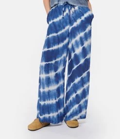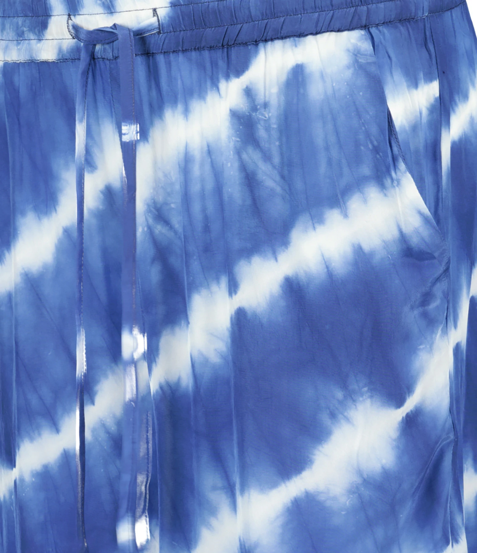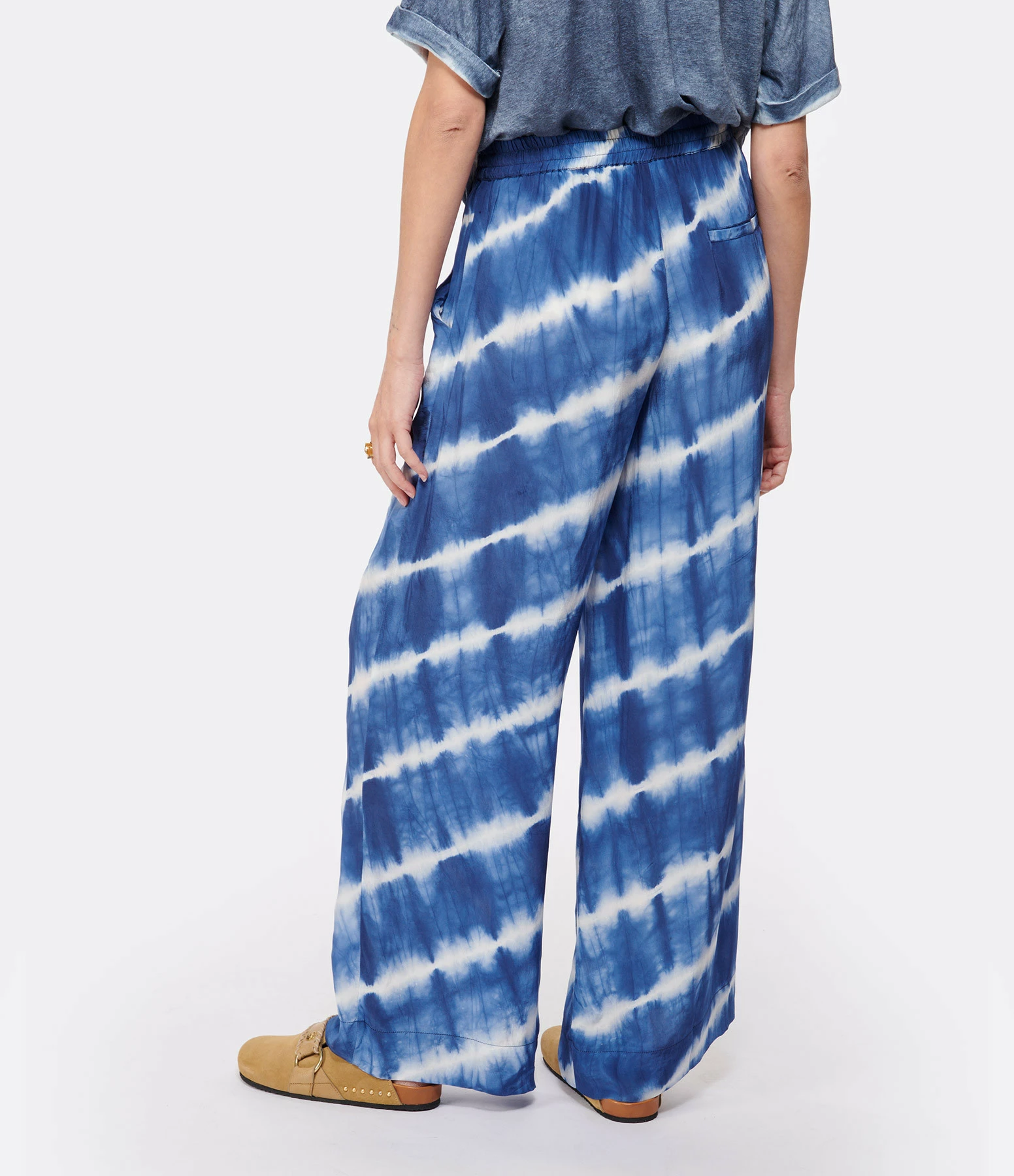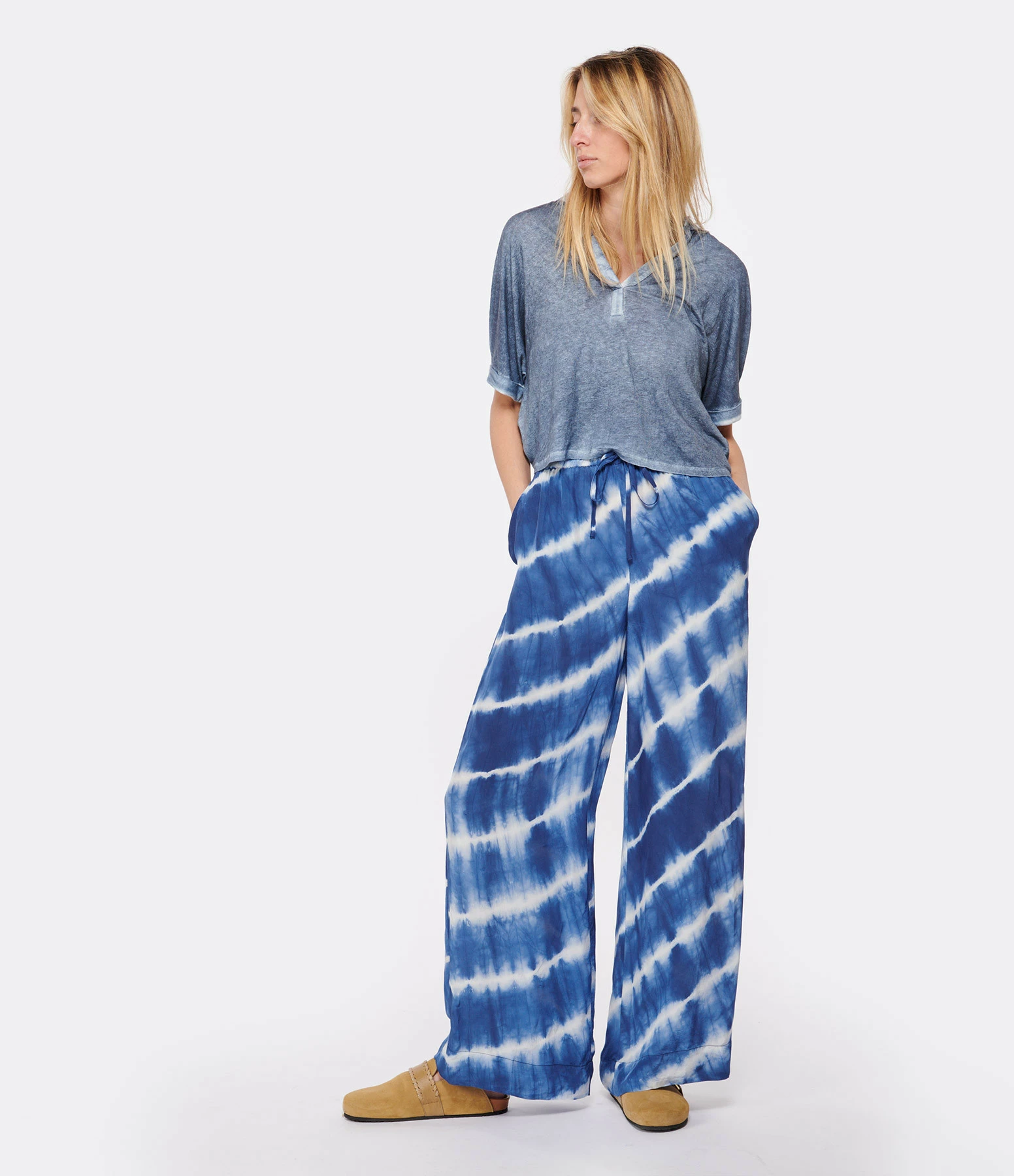 Pantalon fluide à imprimé effet tie and dye bleu. Taille élastiquée avec liens de serrage. Deux poches fendues et une poche passepoilée à l’arrière. Coupe large.