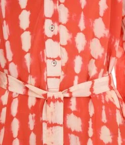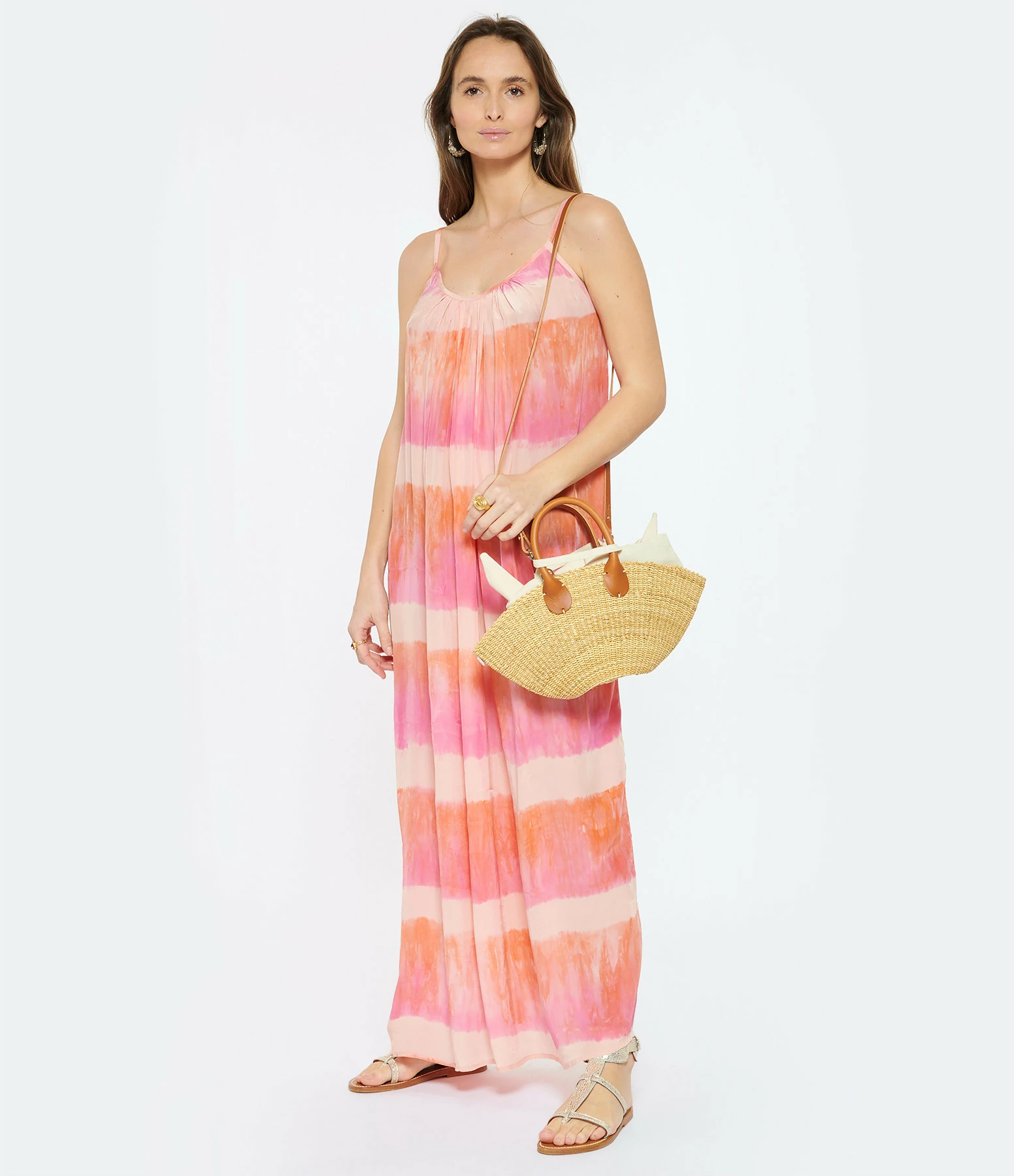 Robe longue à imprimé rose et corail. Bretelles réglables. Coupe ample. Base arrondie. Non doublée.
