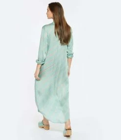Robe chemise longue à rayures turquoises. Col chemise. Manches longues. Fermeture boutonnée. Deux poches fendues. Coupe droite. Base arrondie. Non doublée.