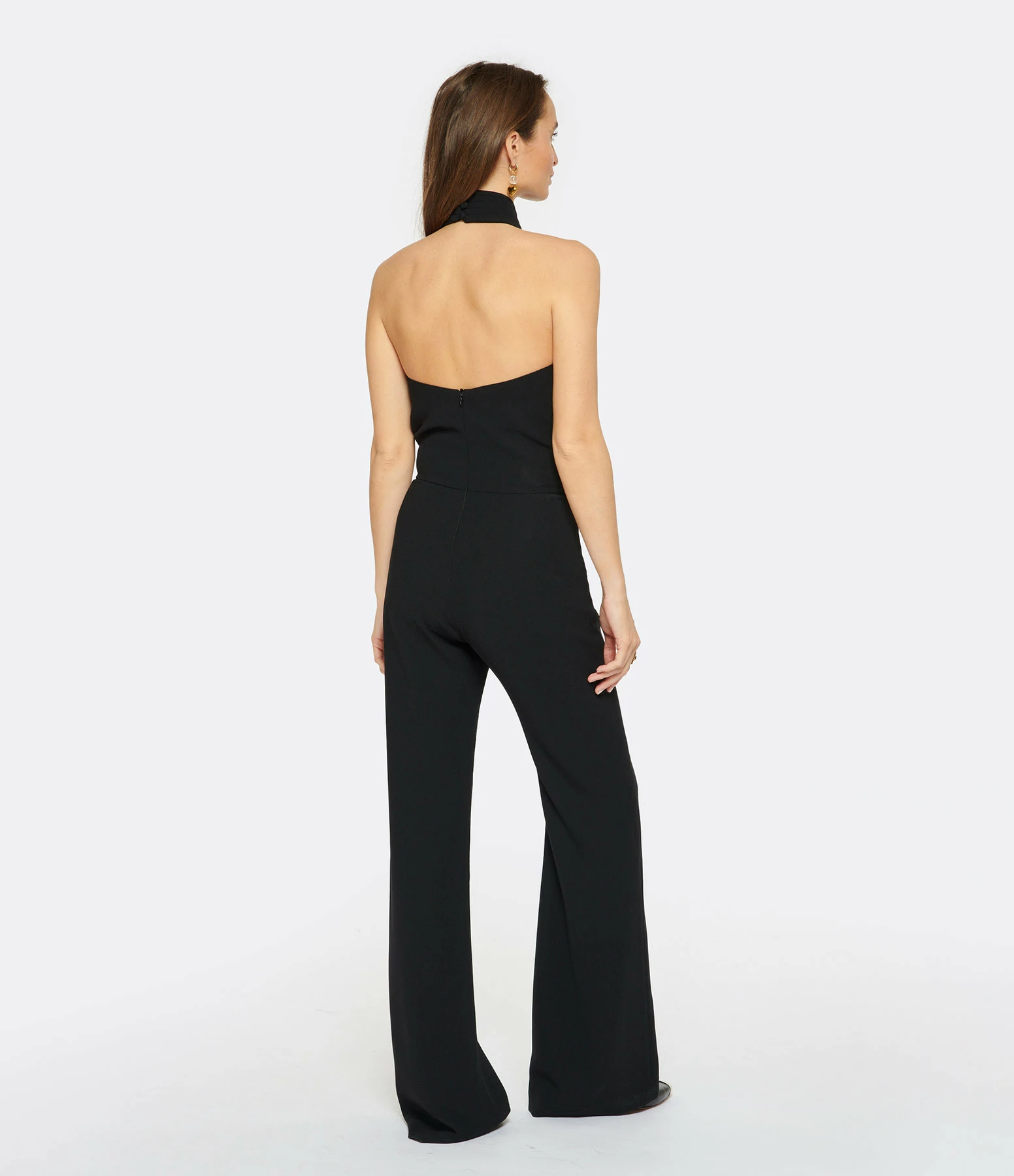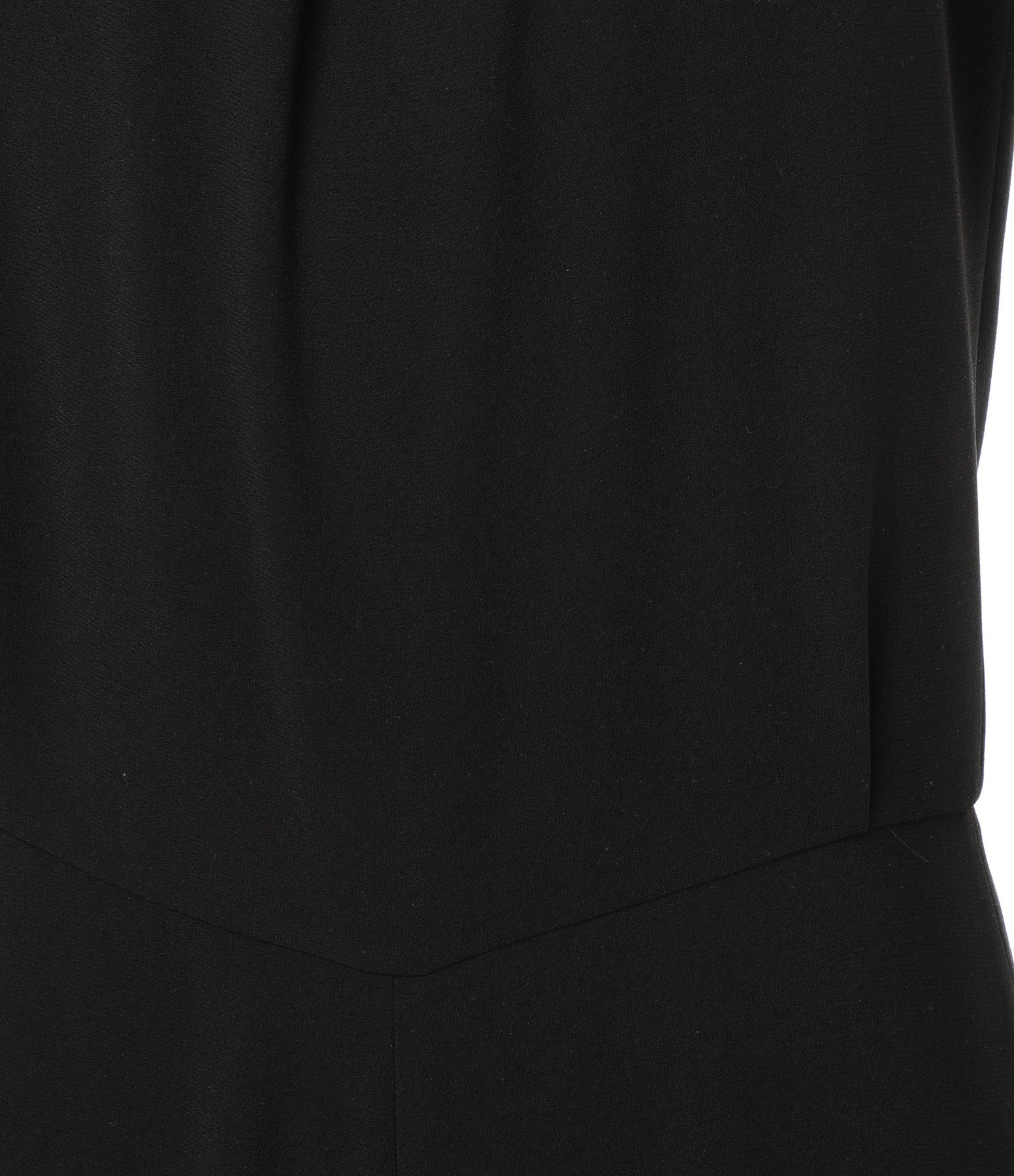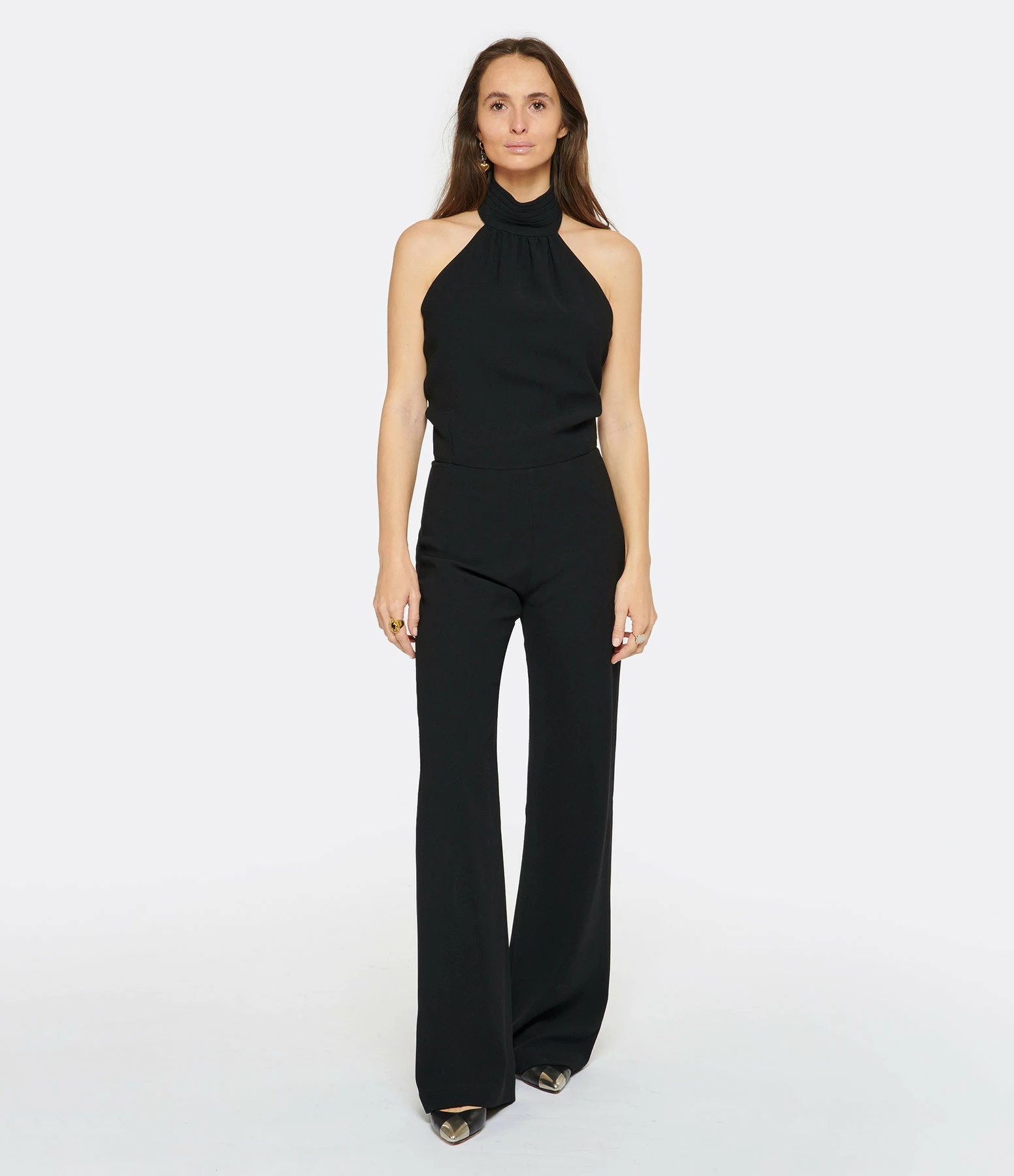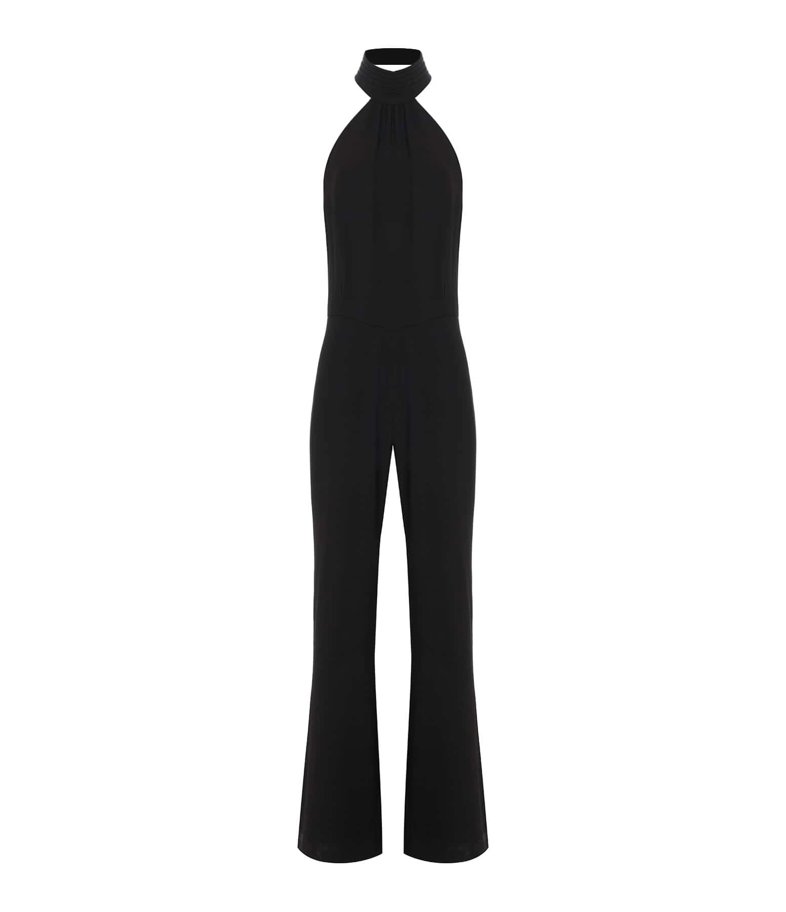 Combinaison en crêpe noire. Col plissé avec boutons dans le dos et zip invisible au milieu du dos. Dos nu. Coupe droite. Non doublée.