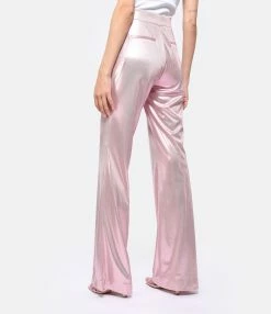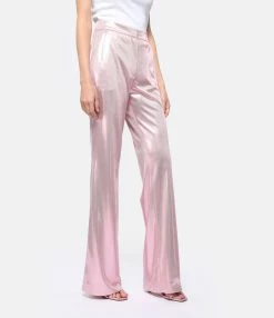 Pantalon fluide rose métallique. Fermeture zippée et par crochet invisible sir le devant. Deux poches passepoilées à l’arrière. Deux poches raglans sur le devant. Coupe droite. Base droite.