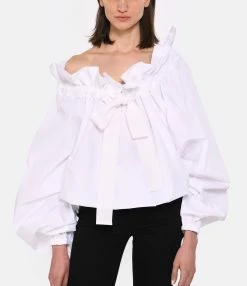 Blouse ample en coton blanc. Col montant à plissé à volant. Lien de serrage au niveau du col. Manches longues bouffantes. Poignets élastiqués. Base droite élastiquée.