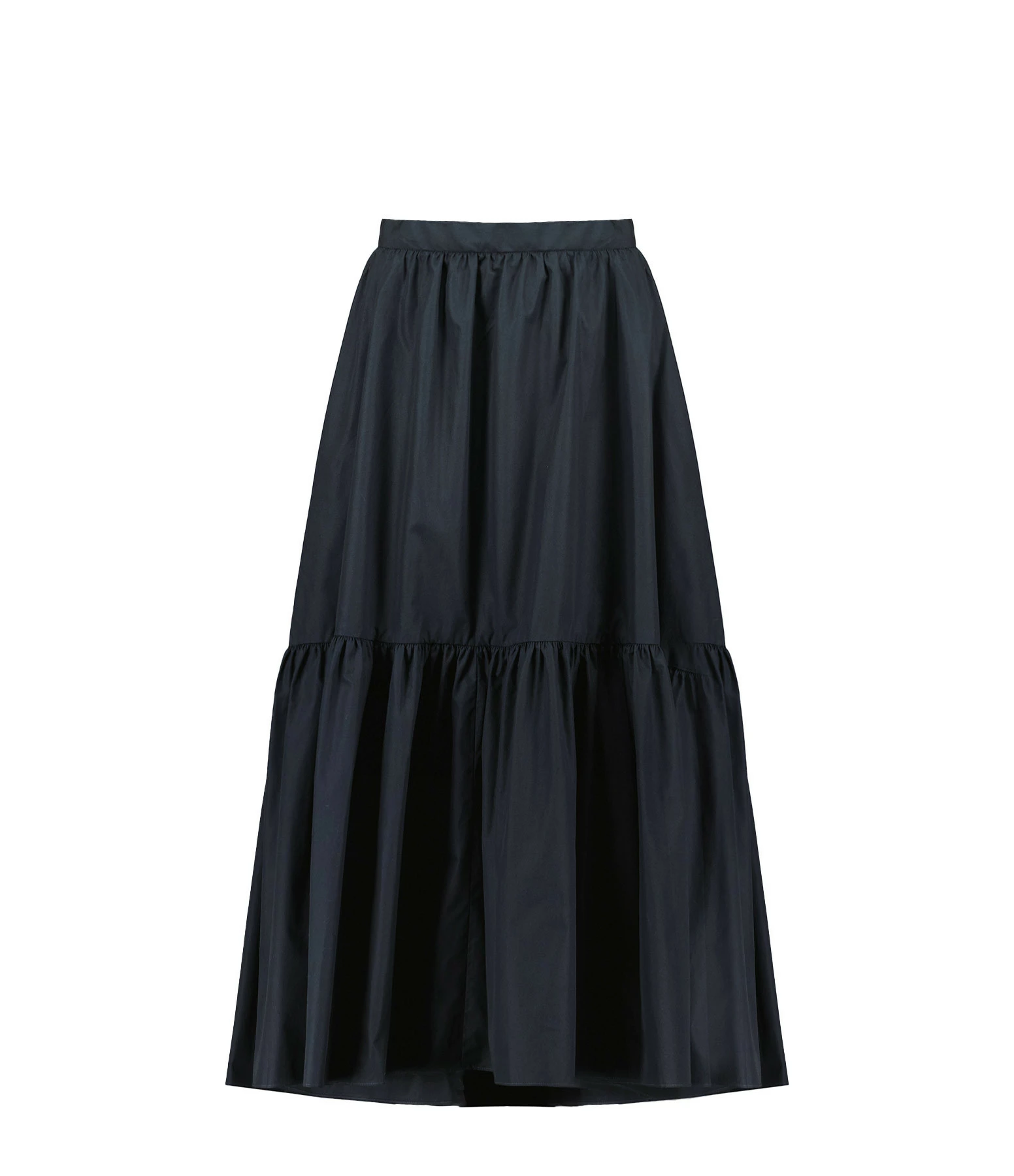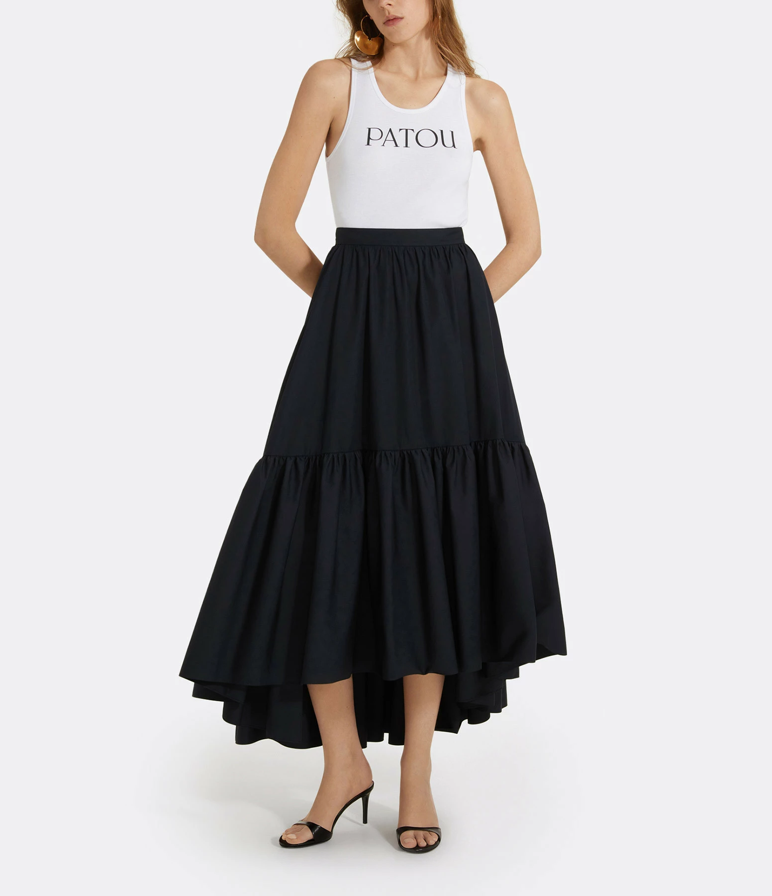 Jupe en popeline de coton bio noir. Détails de volants. Taille haute. Fermeture par zip. Poches sur les côtés. Coupe évasée. Base asymétrique, plus longue à l’arrière.