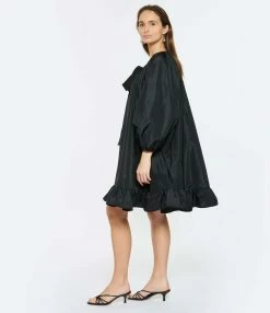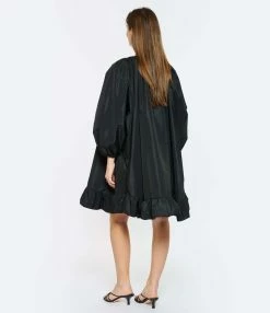 Robe ample en coton noir à volants. Manches trois-quarts bouffantes. Col rond froncé ajustable avec cordons de serrage sur le devant. Volants sur le bas.