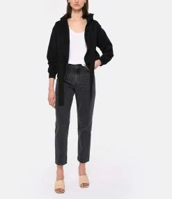 Veste à capuche noire avec cordon de serrage large à nouer. Inscription “PATOU” sérigraphiée en blanc au dos. Fermeture par zip sur le devant. Manches longues. Deux poches à l’avant. Coupe droite. Base droite côtelée.