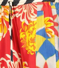 Pantalon en soie à motif floral multicolore. Taille élastiquée avec liens de serrage. Poches latérales. Coupe droite et ample. Base droite.