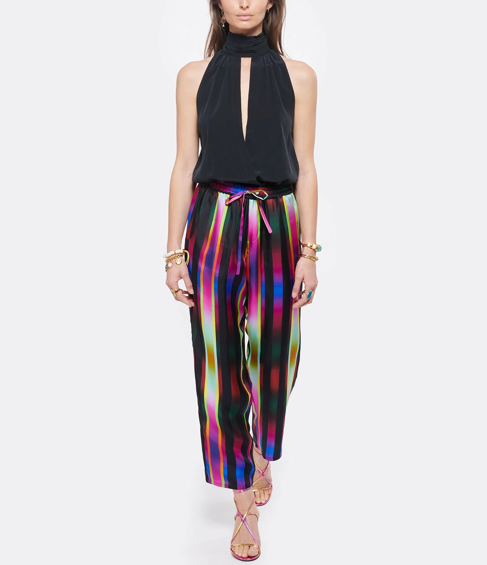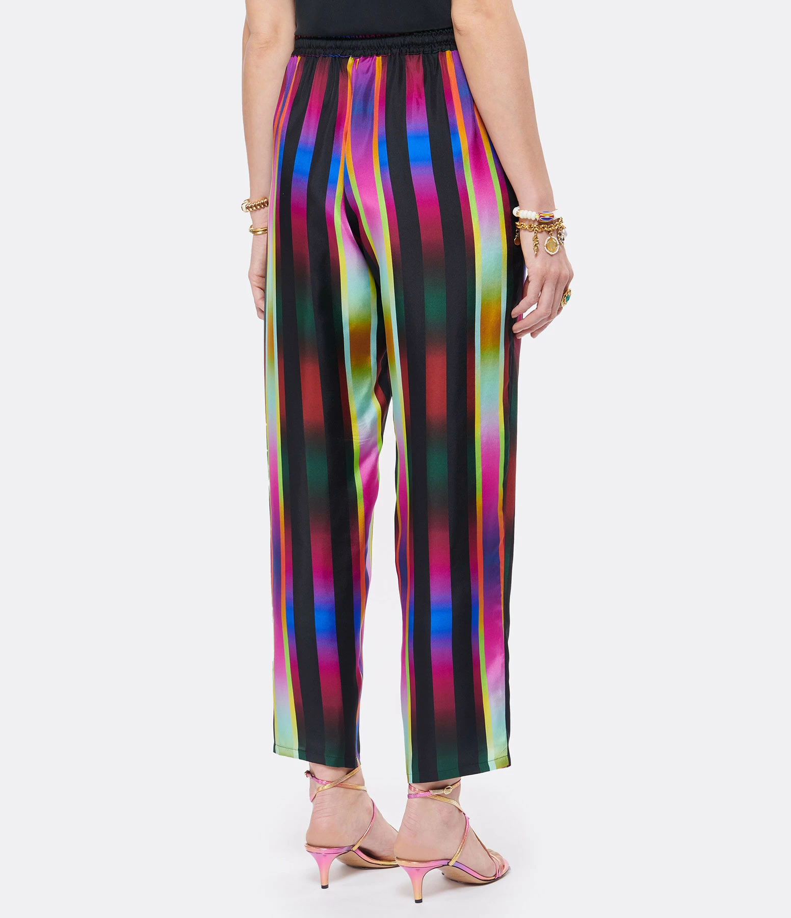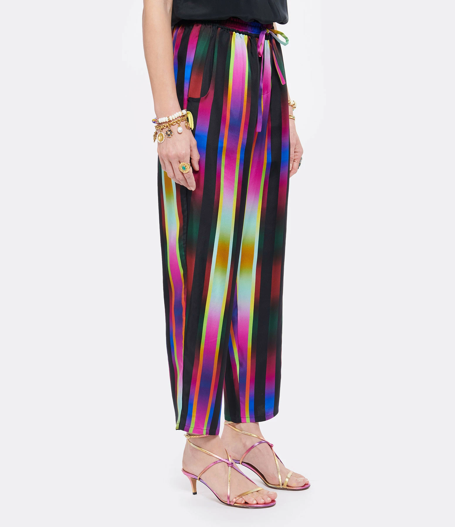 Pantalon multicolore en soie à rayures verticales. Taille élastiquée avec liens de serrage. Poches latérales. Coupe droite et ample.