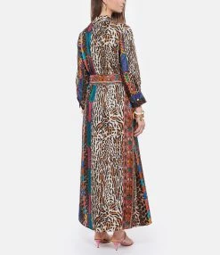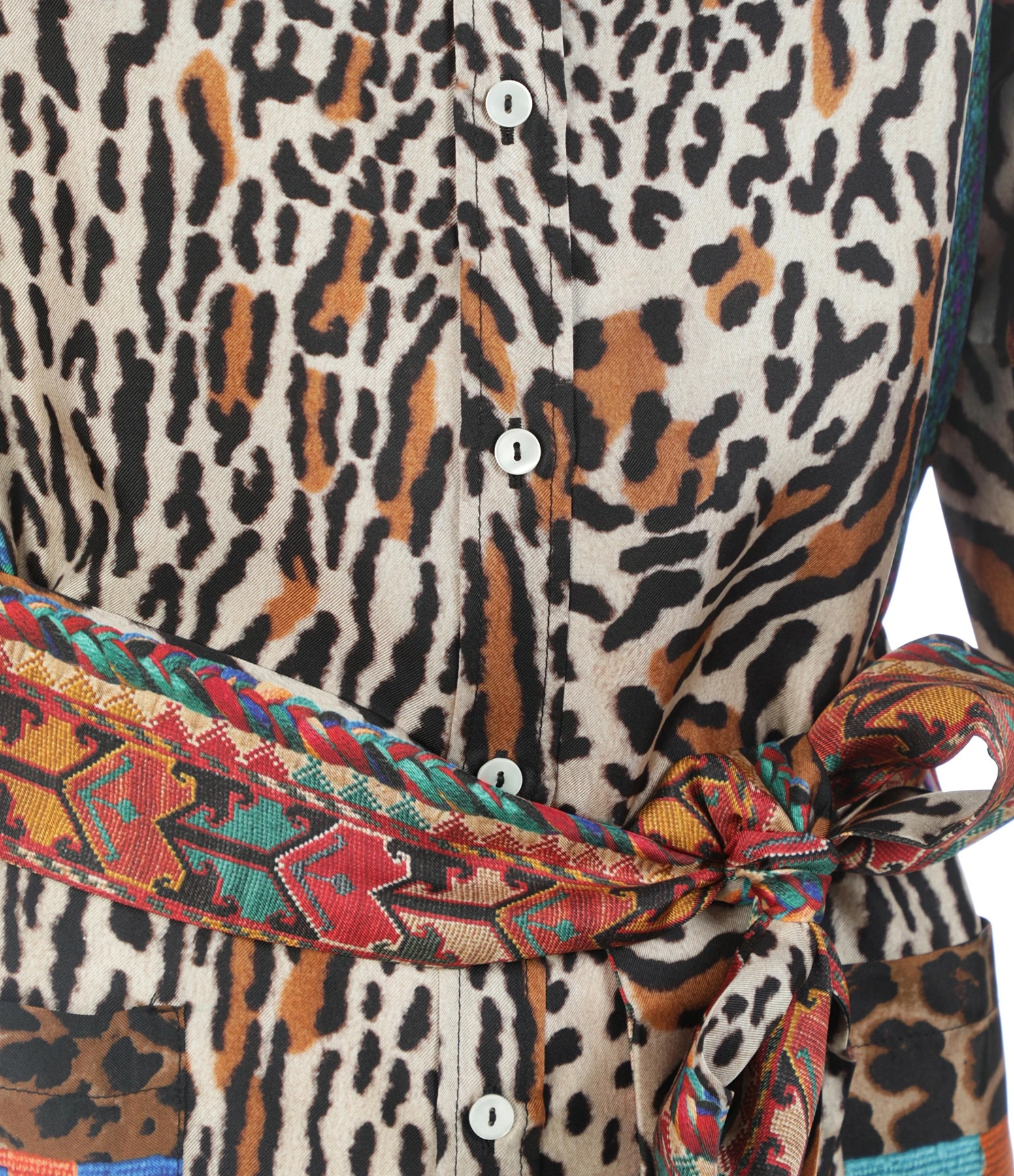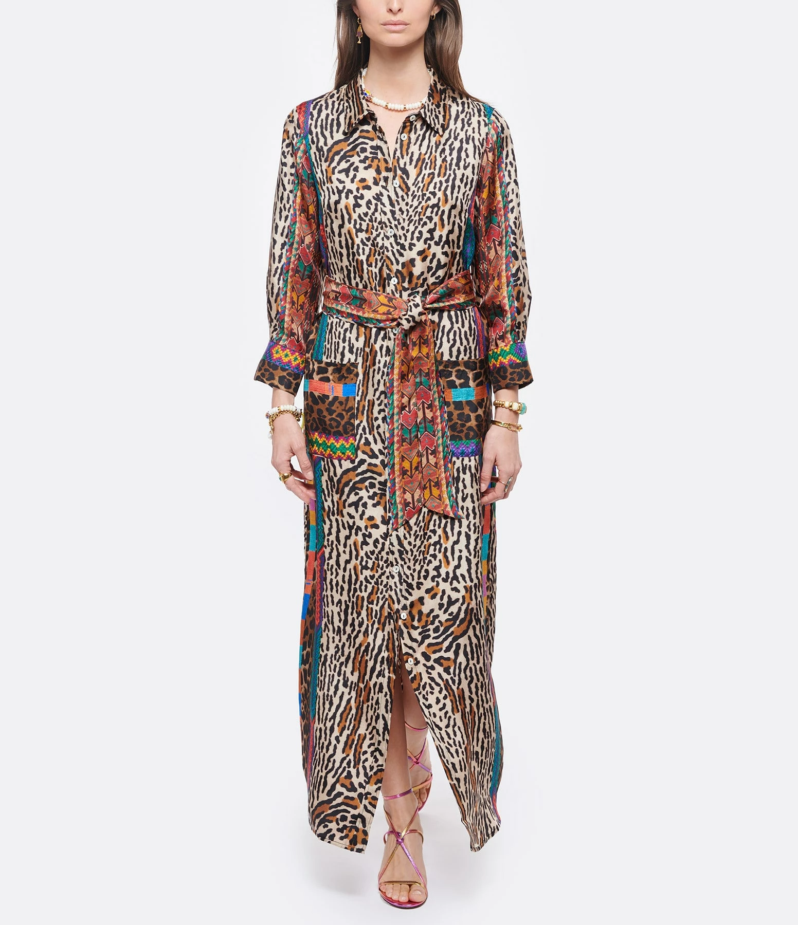 Robe longue en soie imprimé léopard et multicolore. Manches longues. Col chemisier. Fermeture boutonnée. Deux poches plaquées. Ceinture amovible. Coupe droite. Base droite fendue.