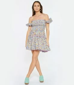 Robe courte fleurie dans les tons violets. Elastiquée au niveau du buste. Manches à porter sous les épaules. Volants sur le bas. Coupe évasée. Base arrondie.