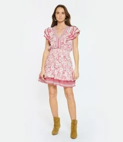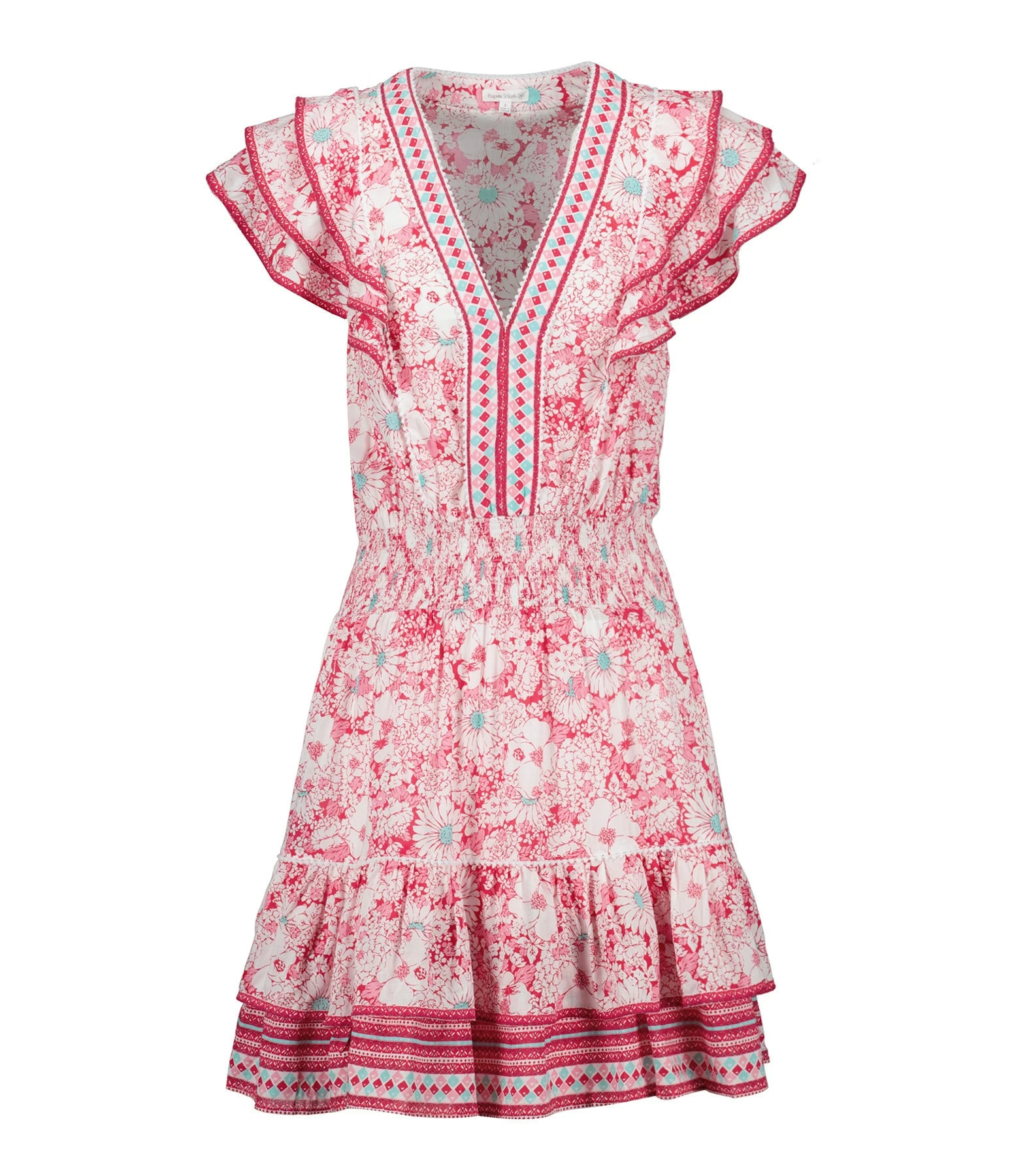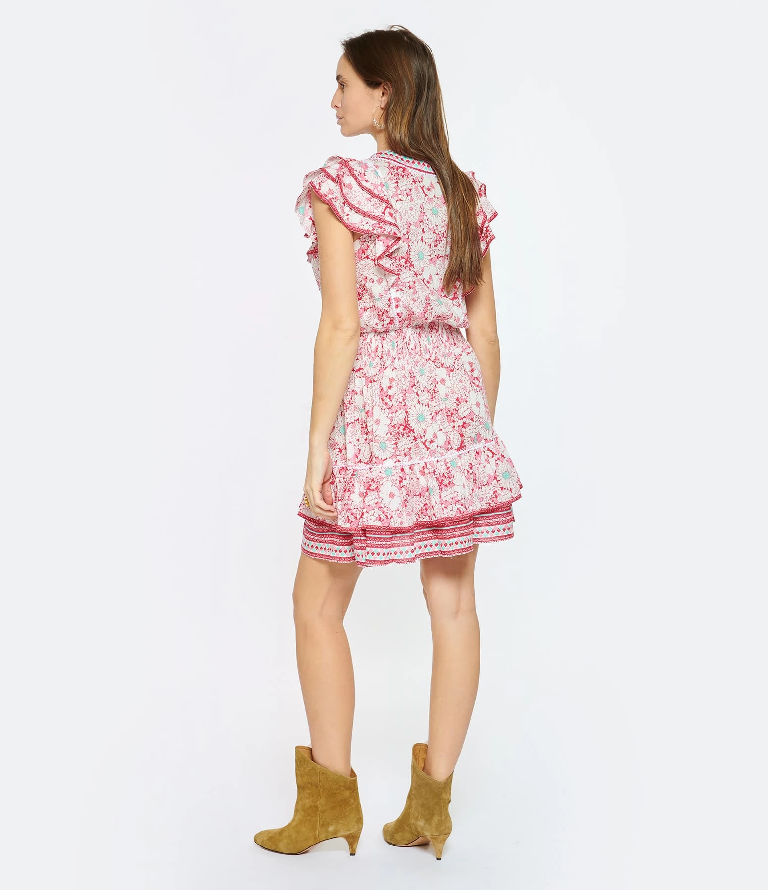 Robe courte fleurie rose. Col en V. Manches courtes à volants. Taille élastiquée. Volants sur le bas. Coupe droite. Base droite.