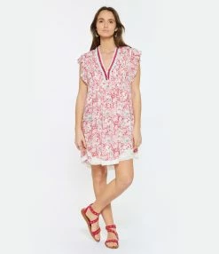 Robe courte fleurie rose. Col en V à franges roses, blanches et turquoises. Manches courtes à volants. Coupe ample. Base droite à dentelle blanche.