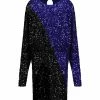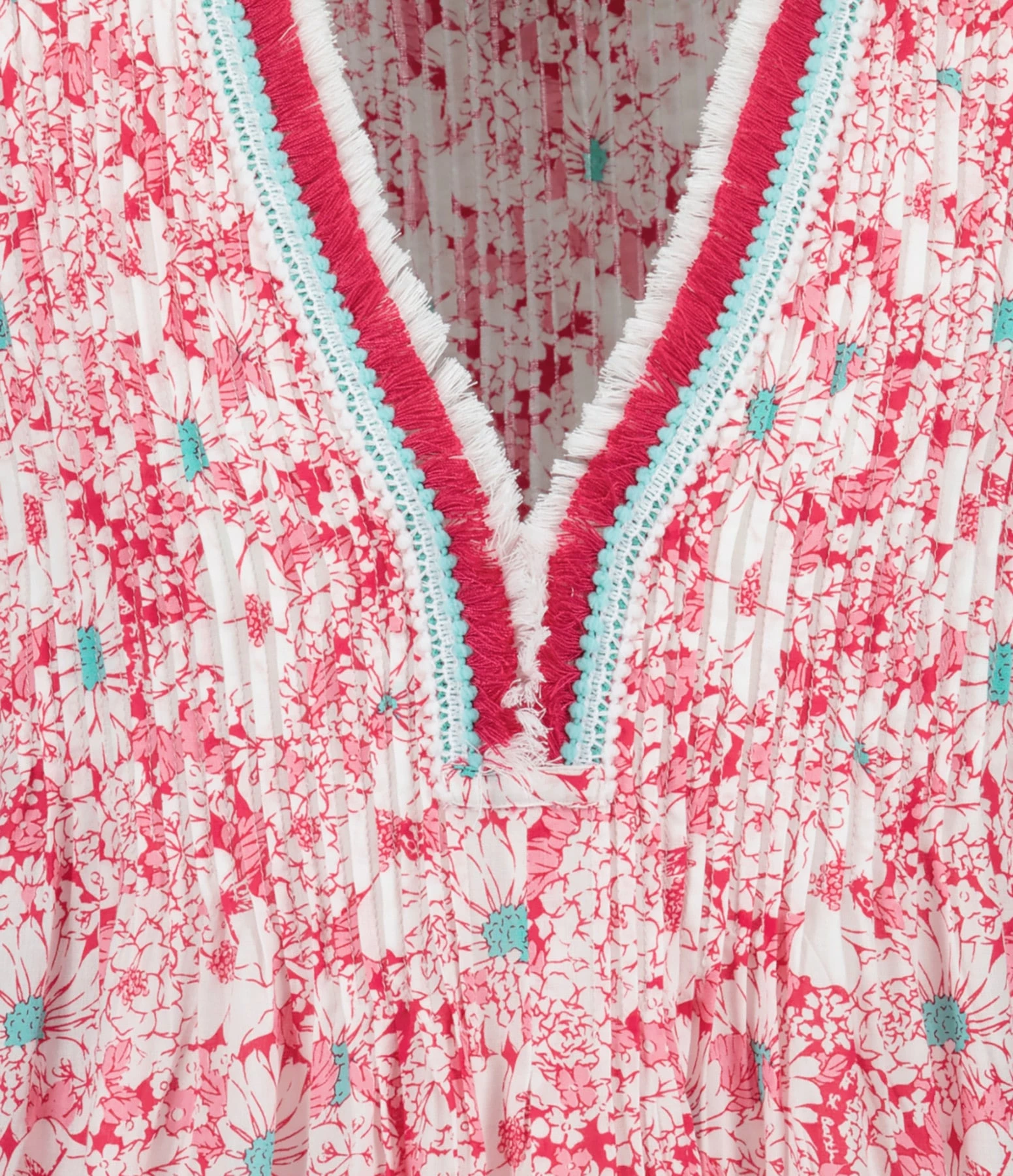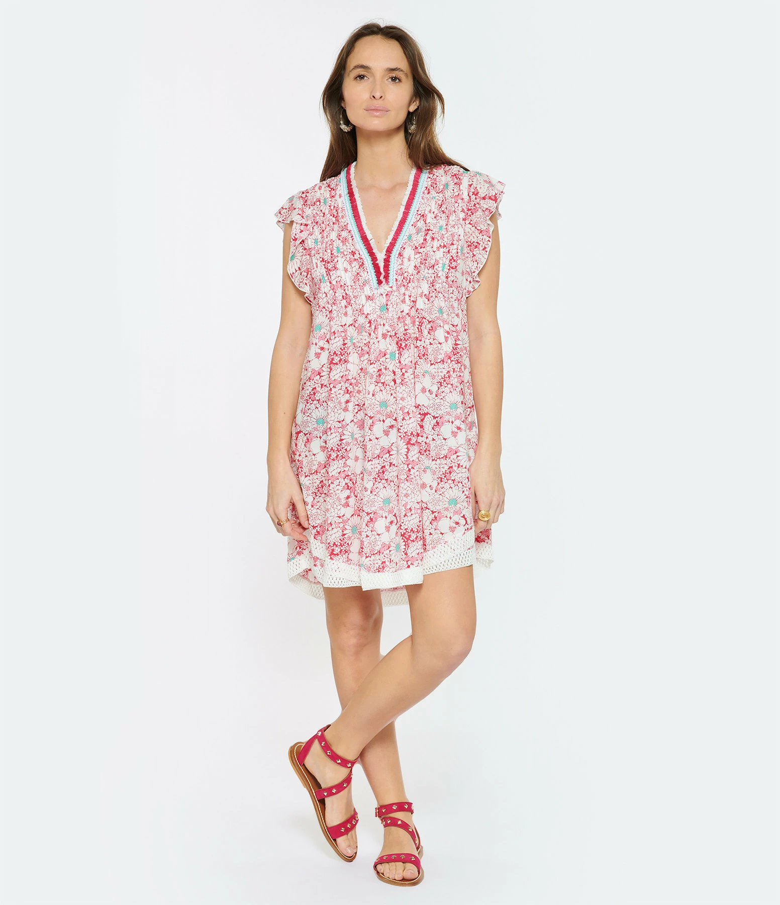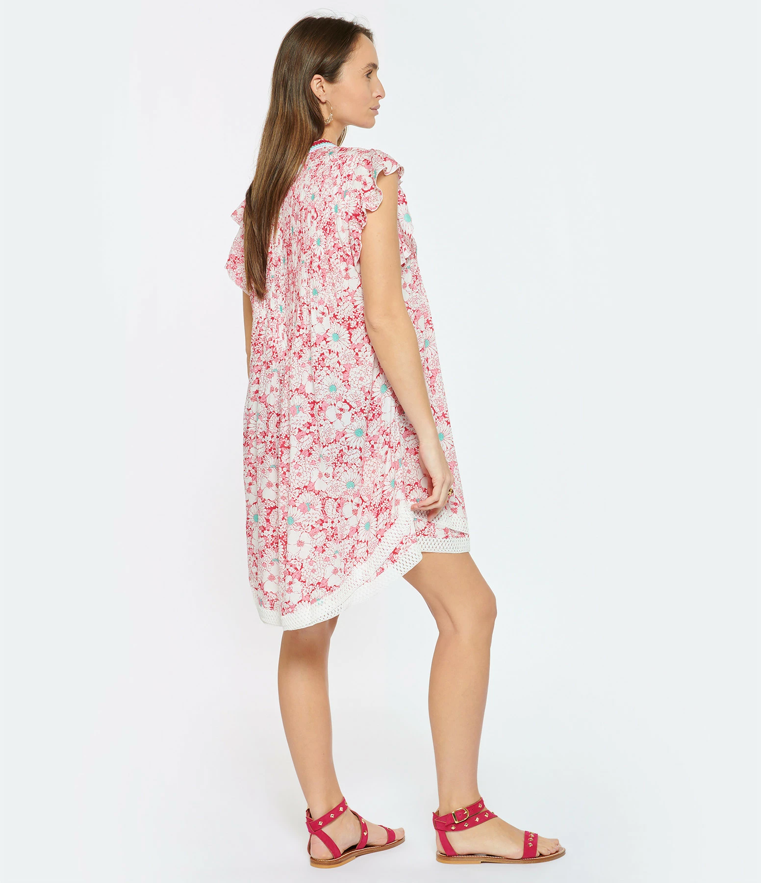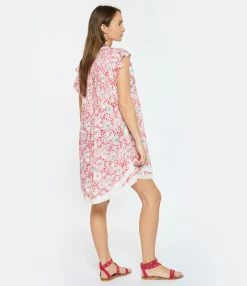 Robe courte fleurie rose. Col en V à franges roses, blanches et turquoises. Manches courtes à volants. Coupe ample. Base droite à dentelle blanche.