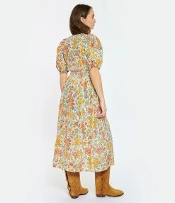 Robe longue fleurie dans les tons oranges. Col en V. Fermeture par boutons sur le devant. Manches courtes bouffantes élastiquées. Fente centrale sur le devant au bas. Coupe droite. Base droite.